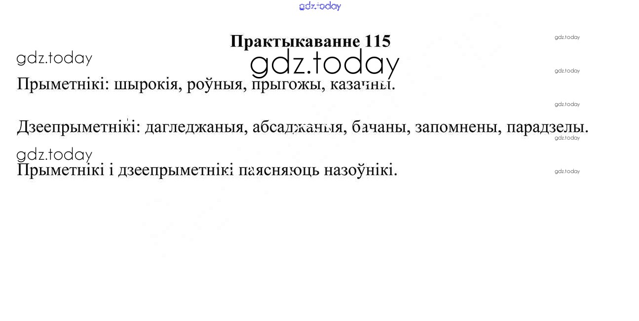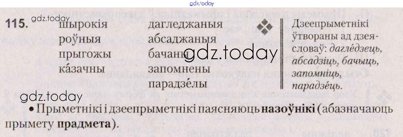 На страницах сайта gdz.today вы найдете учебный и вспомогательный материал, направленный на улучшения знаний школьной программы. ГДЗ - онлайн мир знаний Практыкаванні 115 Учебнику по Белорусскому языку для 7 класса Валочка, Язерская Национальный институт образования 2020