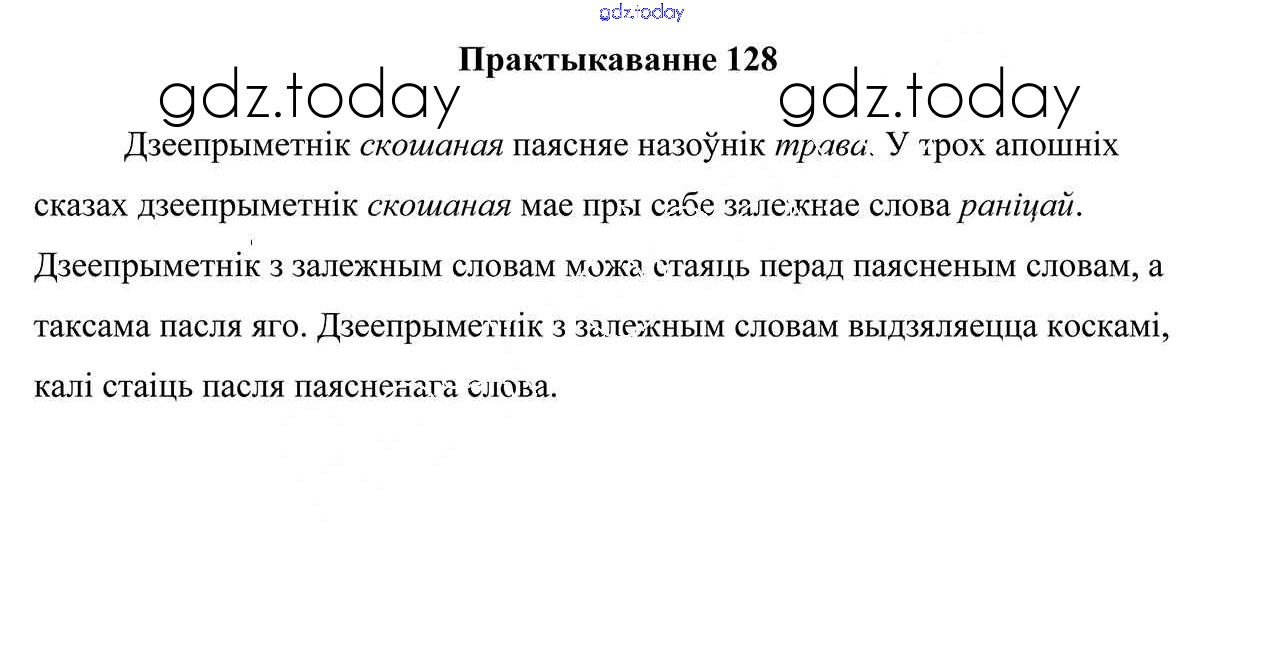 На страницах сайта gdz.today вы найдете учебный и вспомогательный материал, направленный на улучшения знаний школьной программы. ГДЗ - онлайн мир знаний Практыкаванні 128 Учебнику по Белорусскому языку для 7 класса Валочка, Язерская Национальный институт образования 2020