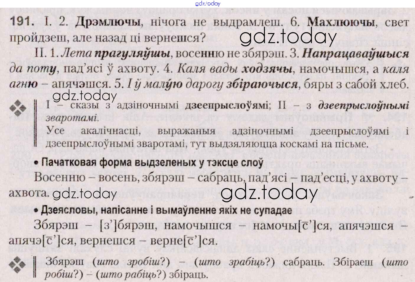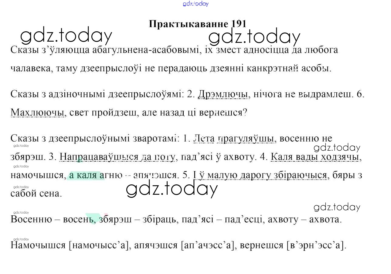 На страницах сайта gdz.today вы найдете учебный и вспомогательный материал, направленный на улучшения знаний школьной программы. ГДЗ - онлайн мир знаний Практыкаванні 191 Учебнику по Белорусскому языку для 7 класса Валочка, Язерская Национальный институт образования 2020