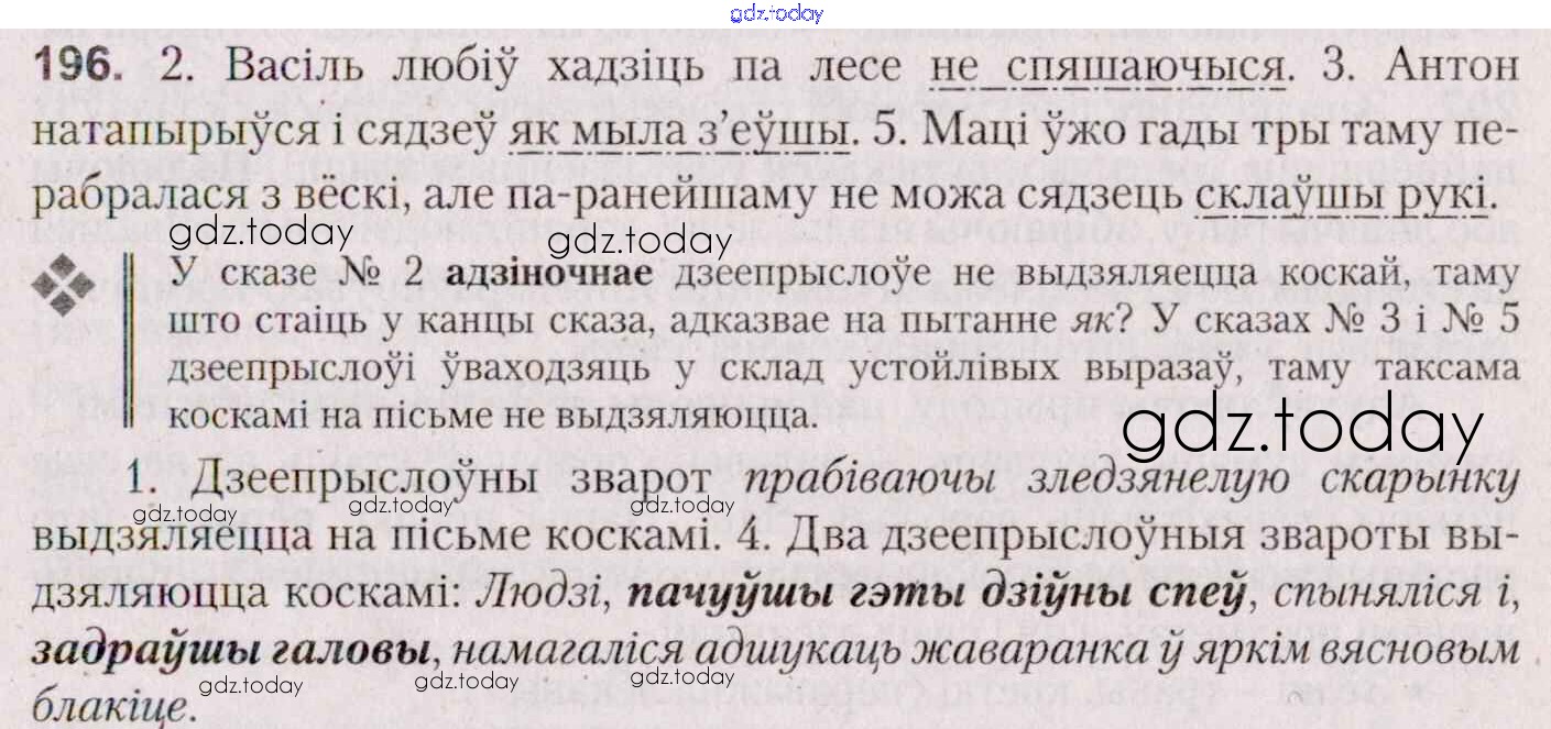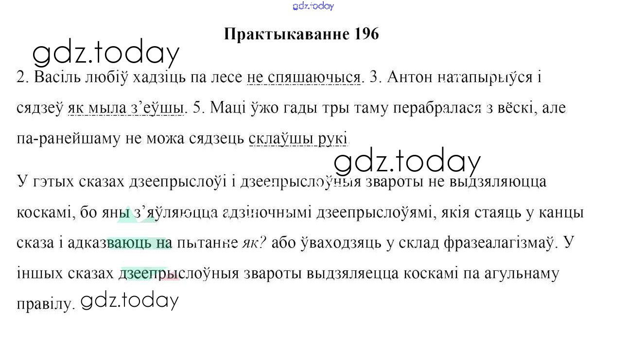 На страницах сайта gdz.today вы найдете учебный и вспомогательный материал, направленный на улучшения знаний школьной программы. ГДЗ - онлайн мир знаний Практыкаванні 196 Учебнику по Белорусскому языку для 7 класса Валочка, Язерская Национальный институт образования 2020
