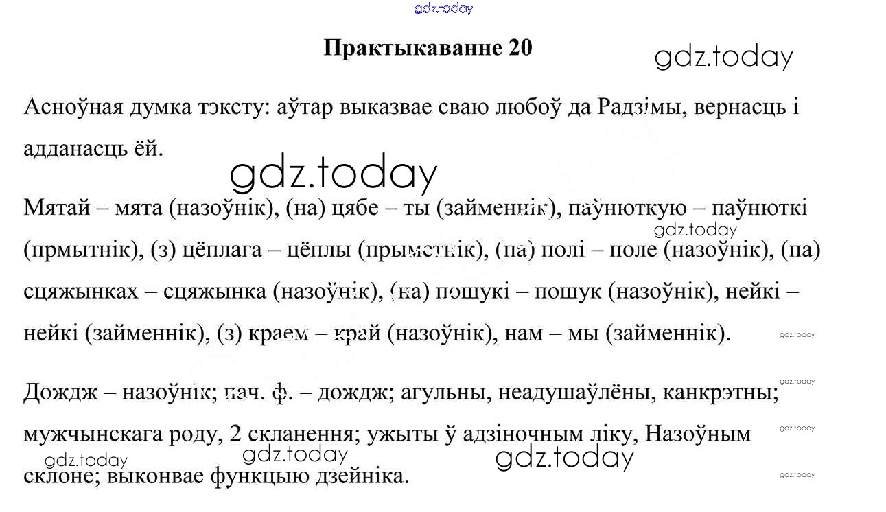 На страницах сайта gdz.today вы найдете учебный и вспомогательный материал, направленный на улучшения знаний школьной программы. ГДЗ - онлайн мир знаний Практыкаванні 20 Учебнику по Белорусскому языку для 7 класса Валочка, Язерская Национальный институт образования 2020