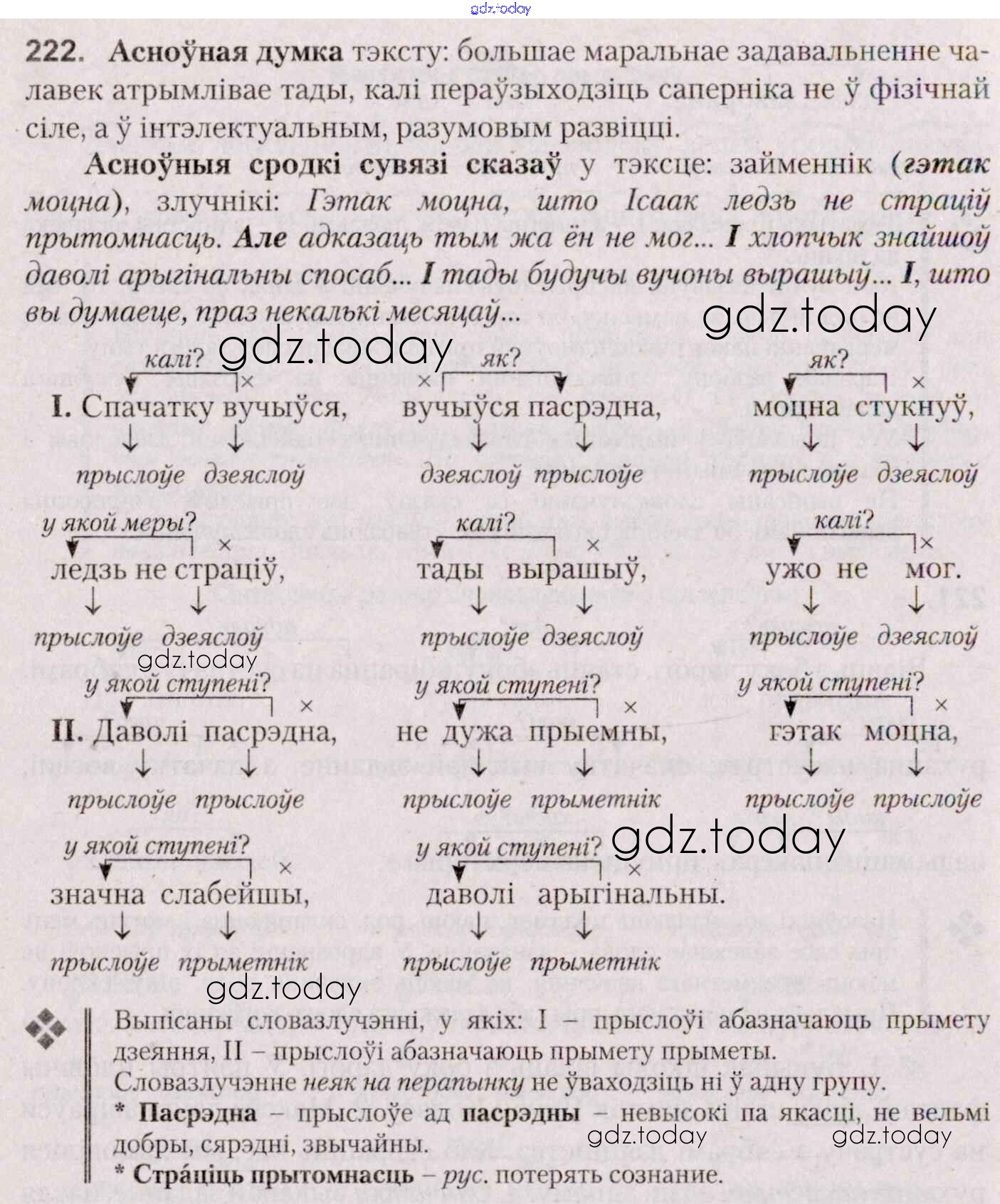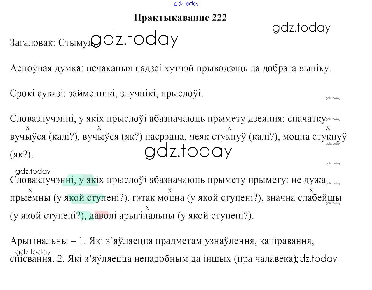 На страницах сайта gdz.today вы найдете учебный и вспомогательный материал, направленный на улучшения знаний школьной программы. ГДЗ - онлайн мир знаний Практыкаванні 222 Учебнику по Белорусскому языку для 7 класса Валочка, Язерская Национальный институт образования 2020