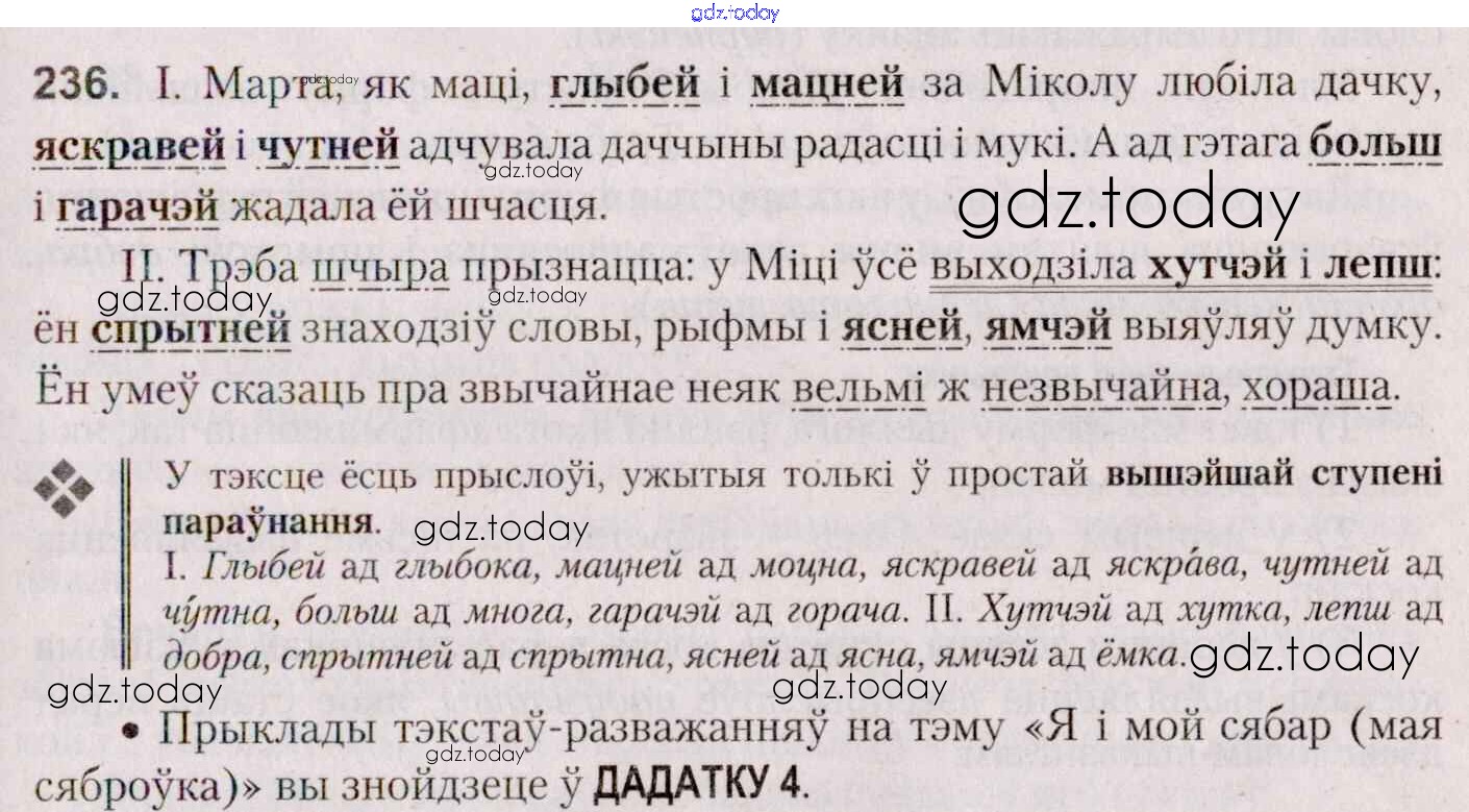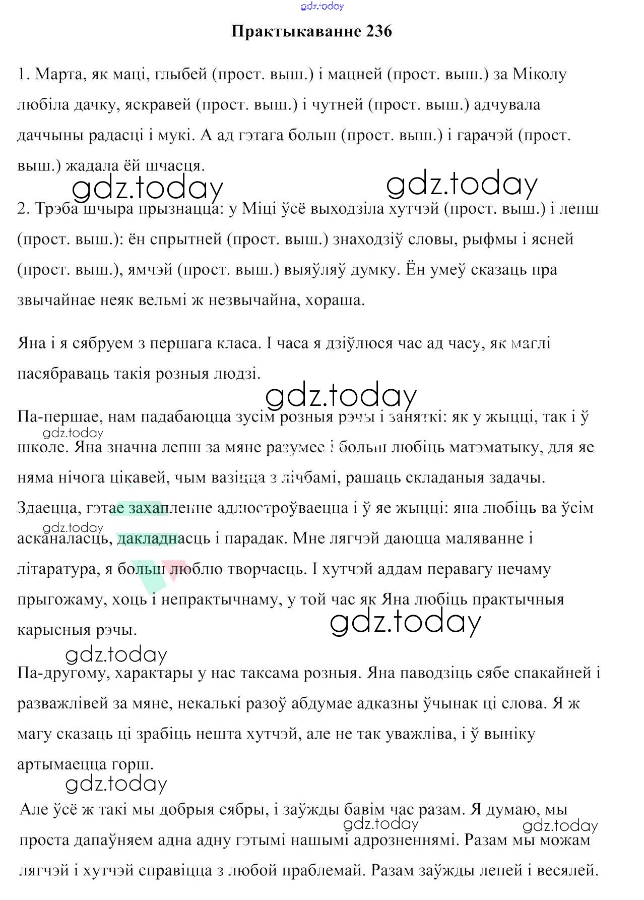 На страницах сайта gdz.today вы найдете учебный и вспомогательный материал, направленный на улучшения знаний школьной программы. ГДЗ - онлайн мир знаний Практыкаванні 236 Учебнику по Белорусскому языку для 7 класса Валочка, Язерская Национальный институт образования 2020