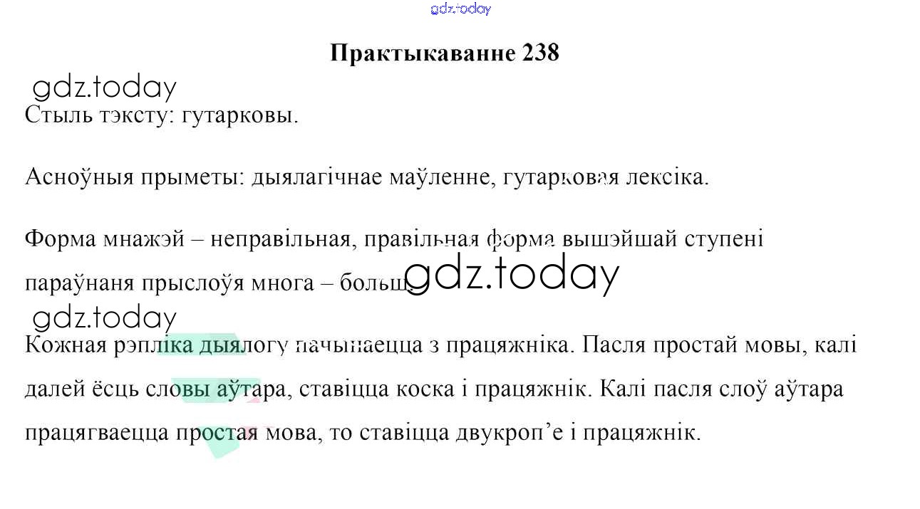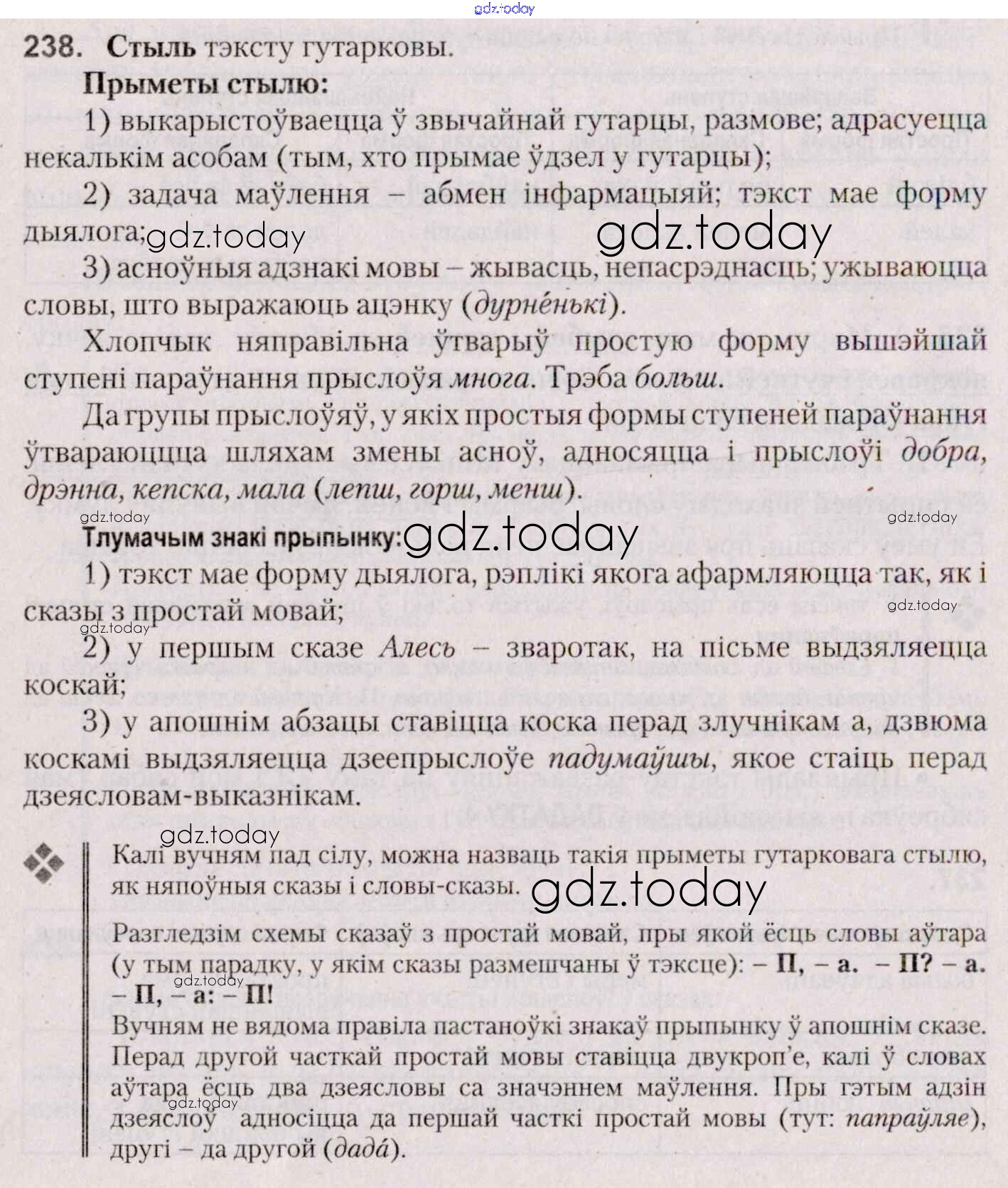На страницах сайта gdz.today вы найдете учебный и вспомогательный материал, направленный на улучшения знаний школьной программы. ГДЗ - онлайн мир знаний Практыкаванні 238 Учебнику по Белорусскому языку для 7 класса Валочка, Язерская Национальный институт образования 2020