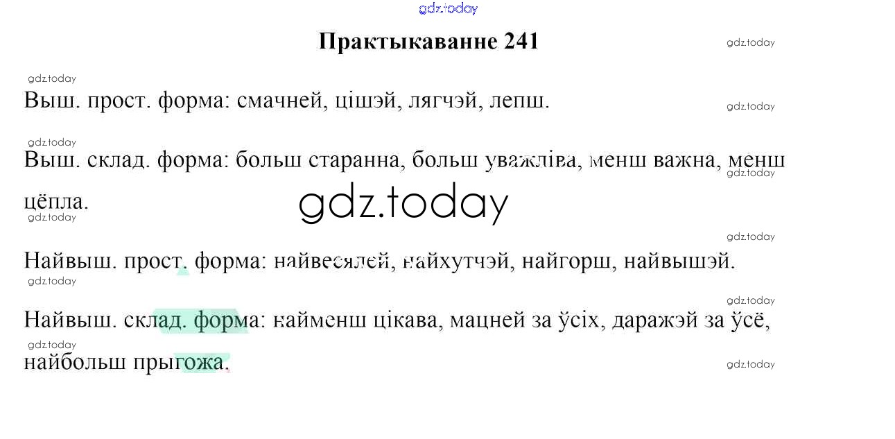 На страницах сайта gdz.today вы найдете учебный и вспомогательный материал, направленный на улучшения знаний школьной программы. ГДЗ - онлайн мир знаний Практыкаванні 241 Учебнику по Белорусскому языку для 7 класса Валочка, Язерская Национальный институт образования 2020
