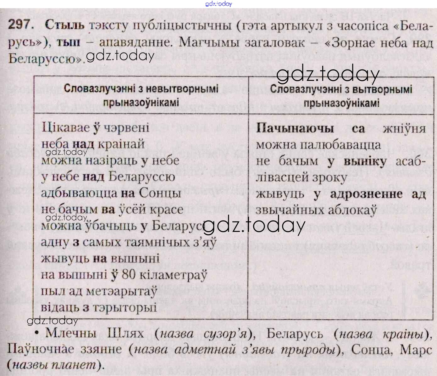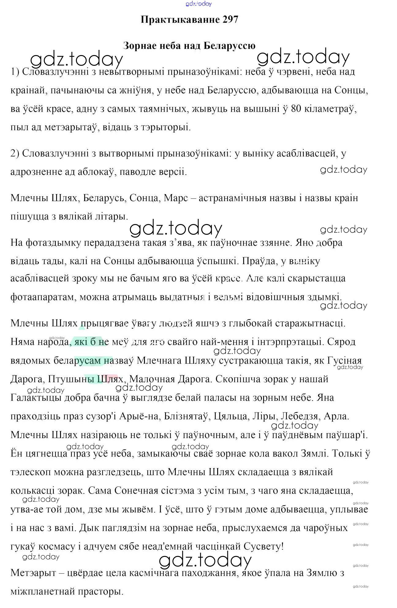 На страницах сайта gdz.today вы найдете учебный и вспомогательный материал, направленный на улучшения знаний школьной программы. ГДЗ - онлайн мир знаний Практыкаванні 297 Учебнику по Белорусскому языку для 7 класса Валочка, Язерская Национальный институт образования 2020