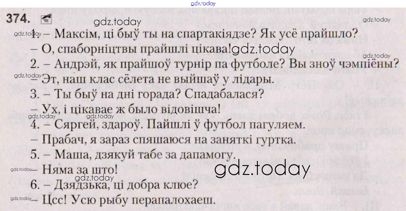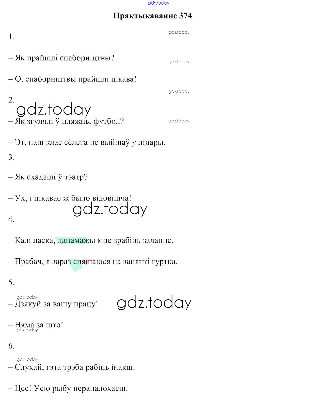 На страницах сайта gdz.today вы найдете учебный и вспомогательный материал, направленный на улучшения знаний школьной программы. ГДЗ - онлайн мир знаний Практыкаванні 374 Учебнику по Белорусскому языку для 7 класса Валочка, Язерская Национальный институт образования 2020