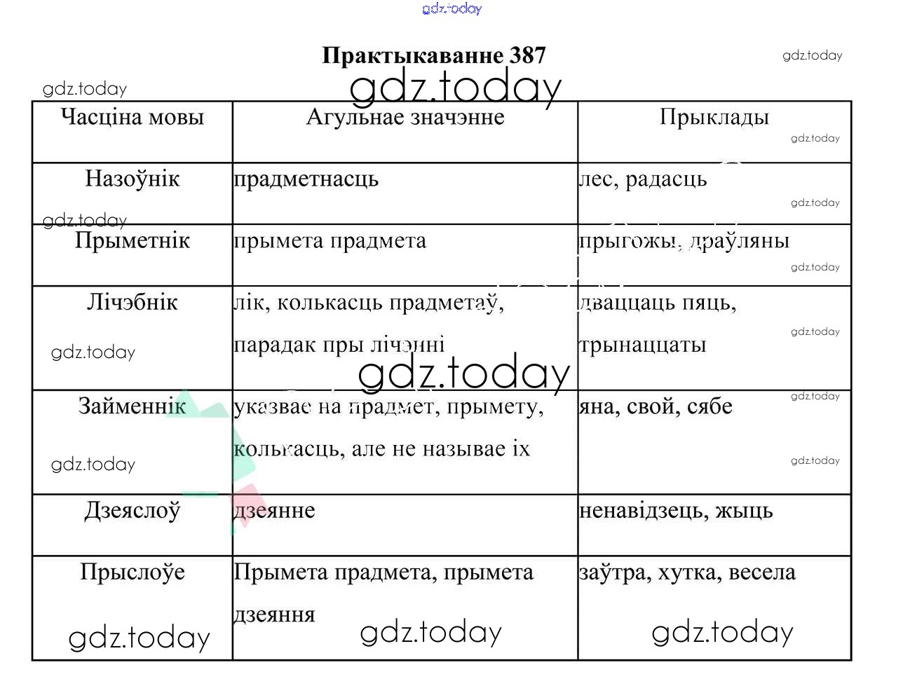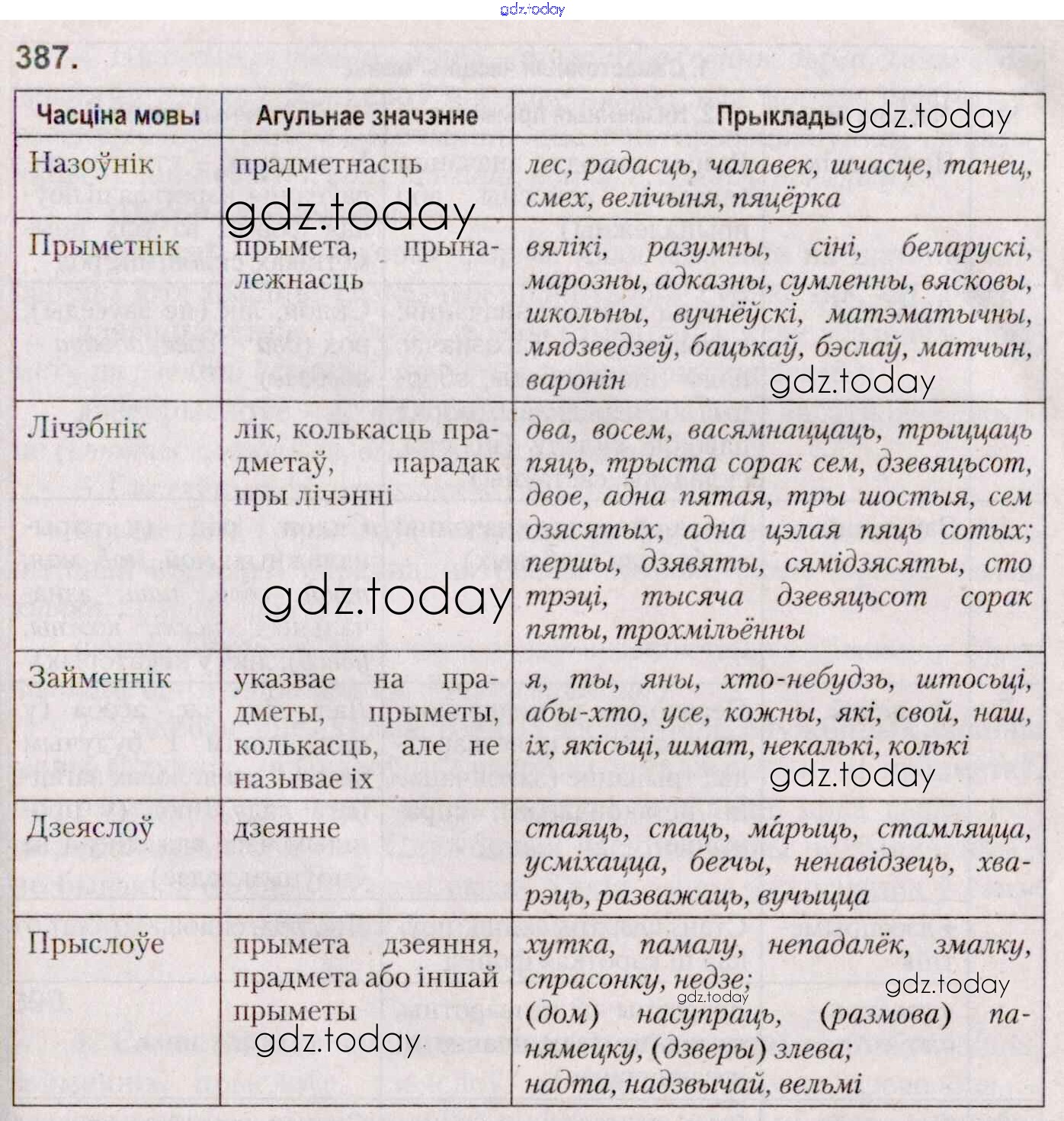 На страницах сайта gdz.today вы найдете учебный и вспомогательный материал, направленный на улучшения знаний школьной программы. ГДЗ - онлайн мир знаний Практыкаванні 387 Учебнику по Белорусскому языку для 7 класса Валочка, Язерская Национальный институт образования 2020