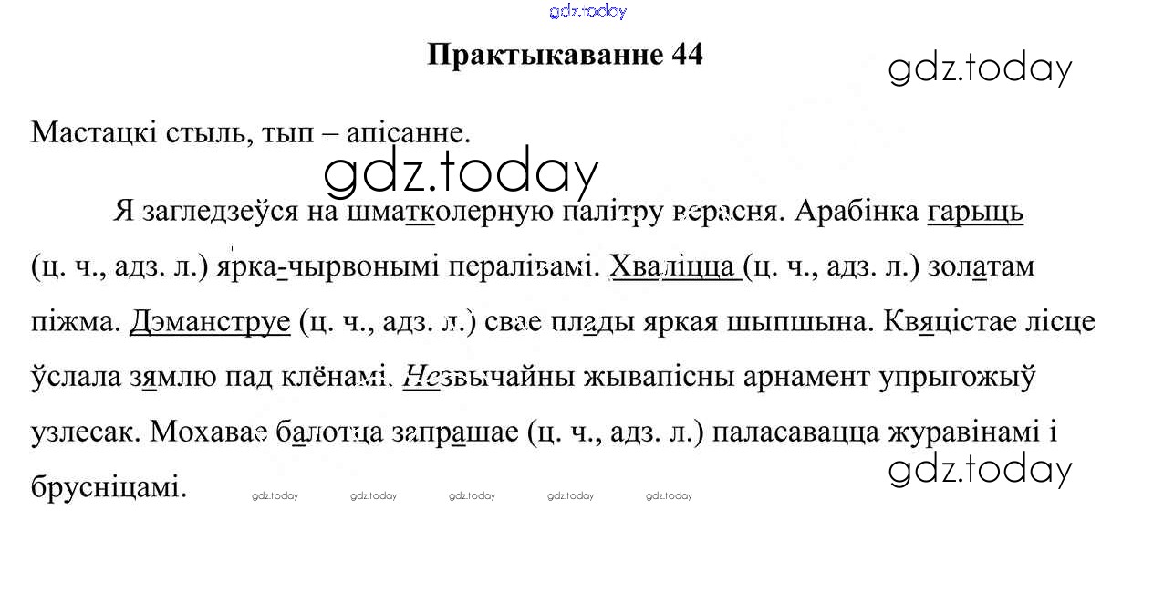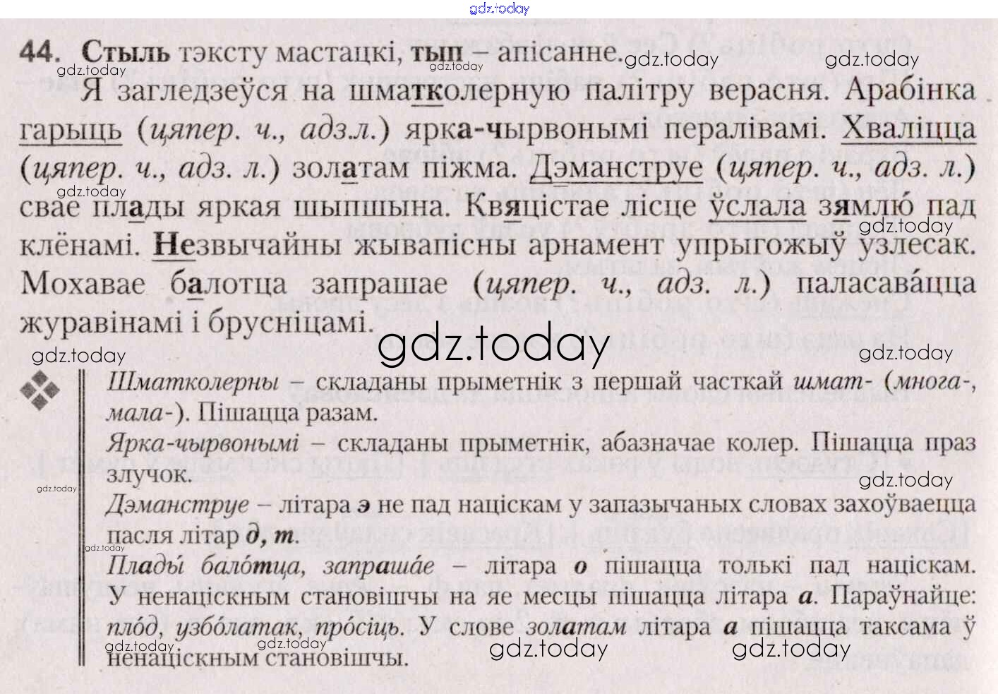 На страницах сайта gdz.today вы найдете учебный и вспомогательный материал, направленный на улучшения знаний школьной программы. ГДЗ - онлайн мир знаний Практыкаванні 44 Учебнику по Белорусскому языку для 7 класса Валочка, Язерская Национальный институт образования 2020