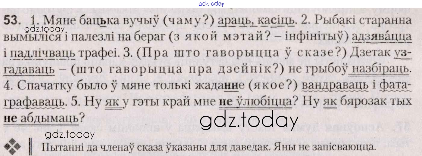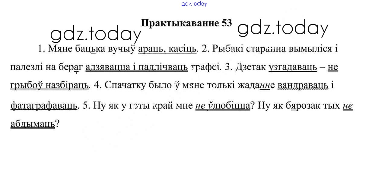 На страницах сайта gdz.today вы найдете учебный и вспомогательный материал, направленный на улучшения знаний школьной программы. ГДЗ - онлайн мир знаний Практыкаванні 53 Учебнику по Белорусскому языку для 7 класса Валочка, Язерская Национальный институт образования 2020