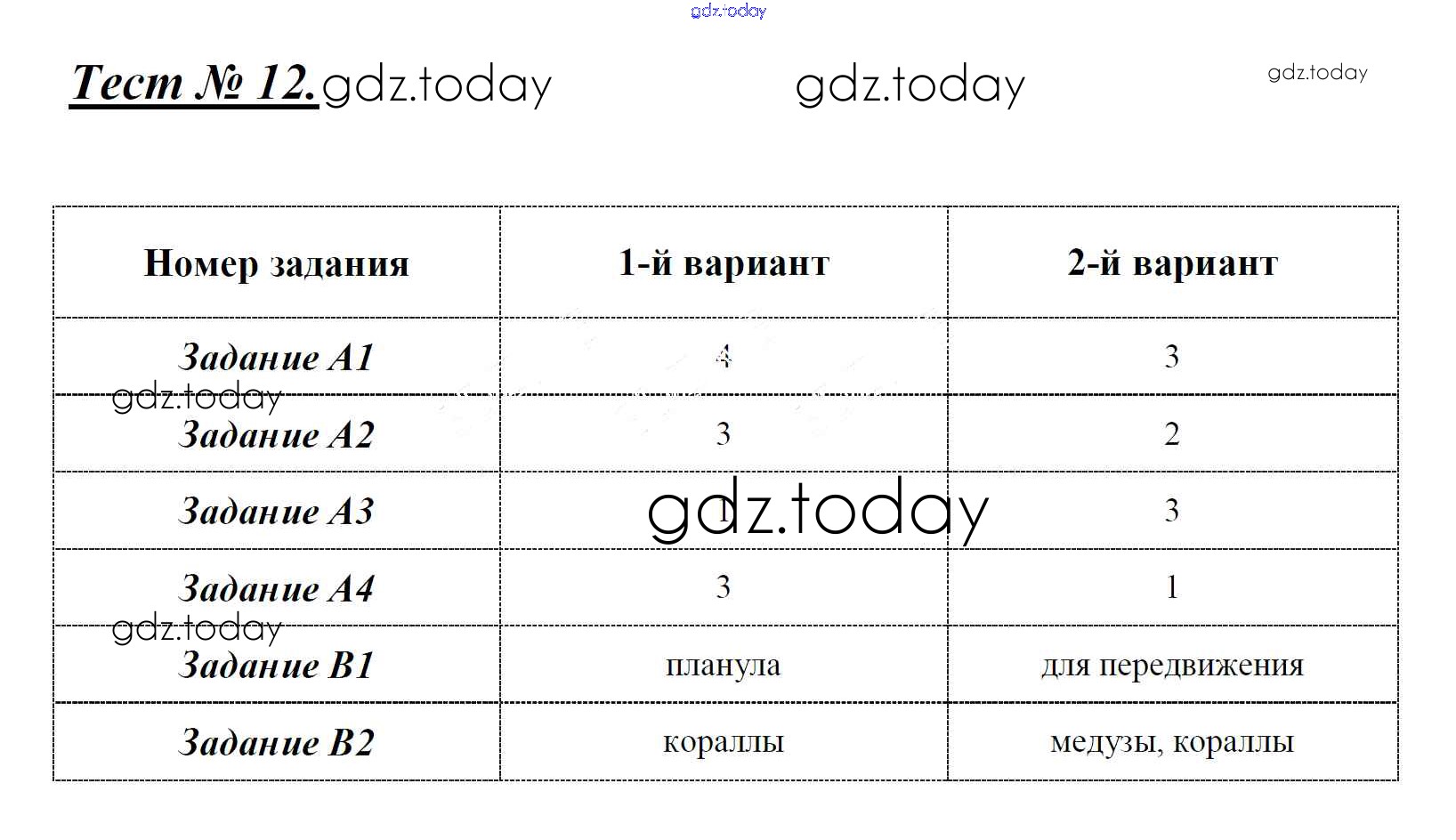 На страницах сайта gdz.today вы найдете учебный и вспомогательный материал, направленный на улучшения знаний школьной программы. ГДЗ - онлайн мир знаний Решение к тестам Тест 12. Подцарство многоклеточные животные. Морские кишечнополостные Контрольно-измерительным материалам (КИМ) по Биологии для 7 класса Артемьева ВАКО 2018