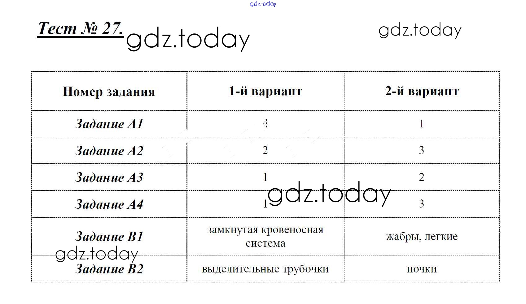 На страницах сайта gdz.today вы найдете учебный и вспомогательный материал, направленный на улучшения знаний школьной программы. ГДЗ - онлайн мир знаний Решение к тестам Тест 27. Тип хордовые. Общие признаки хордовых животных Контрольно-измерительным материалам (КИМ) по Биологии для 7 класса Артемьева ВАКО 2018