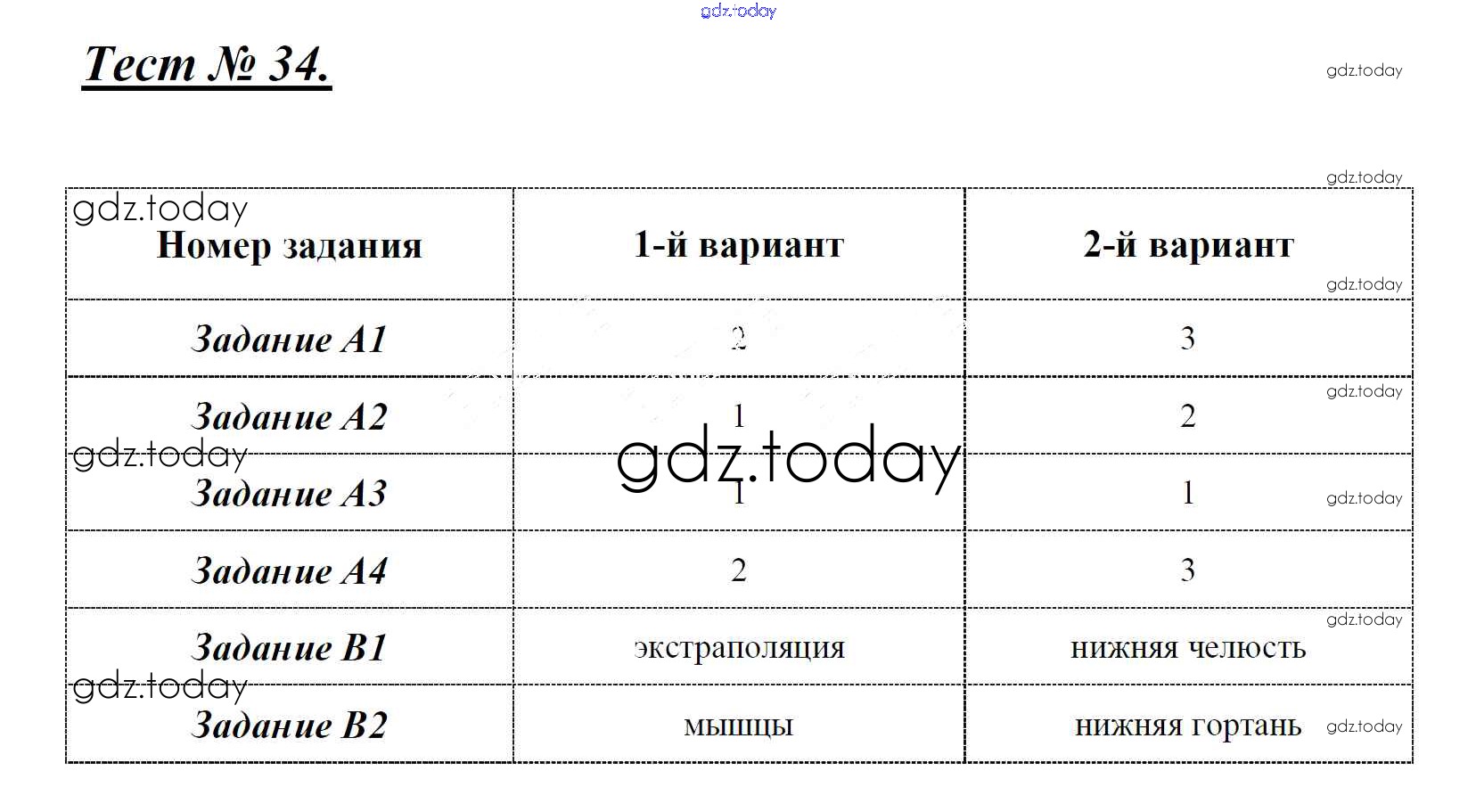 Ответы к Решение к тестам Тест 34. Класс птицы. Среда обитания и внешнее строение птиц Контрольно-измерительным материалам (КИМ) по Биологии для 7 класса Артемьева ВАКО 2018