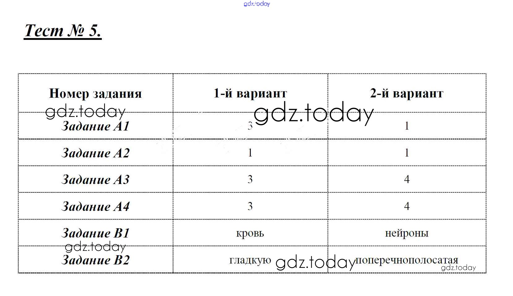 Ответы к Решение к тестам Тест 5. Строение тела животных. Ткани Контрольно-измерительным материалам (КИМ) по Биологии для 7 класса Артемьева ВАКО 2018