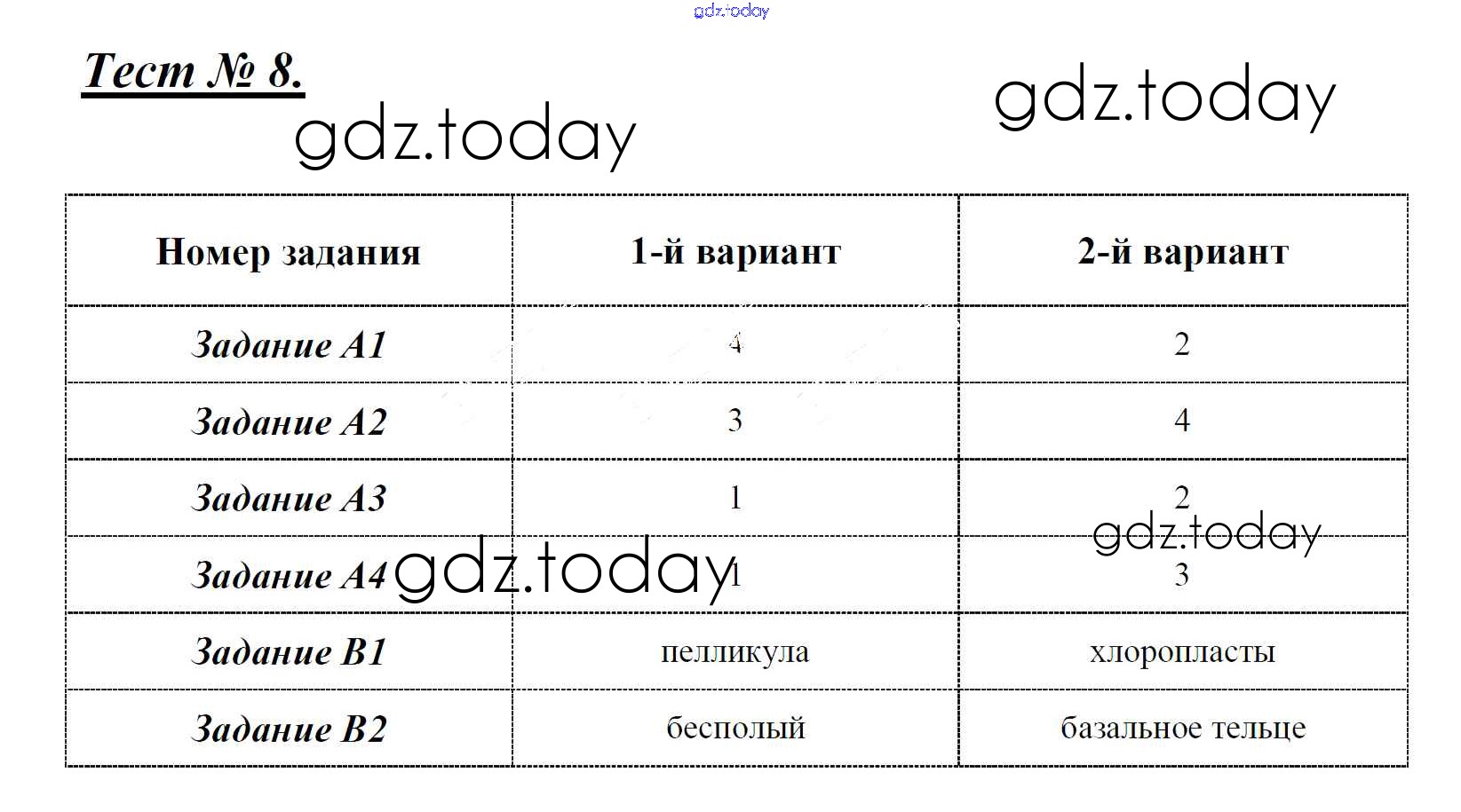 На страницах сайта gdz.today вы найдете учебный и вспомогательный материал, направленный на улучшения знаний школьной программы. ГДЗ - онлайн мир знаний Решение к тестам Тест 8. Подцарство простейшие, или одноклеточные. Подтип жгутиконосцы Контрольно-измерительным материалам (КИМ) по Биологии для 7 класса Артемьева ВАКО 2018