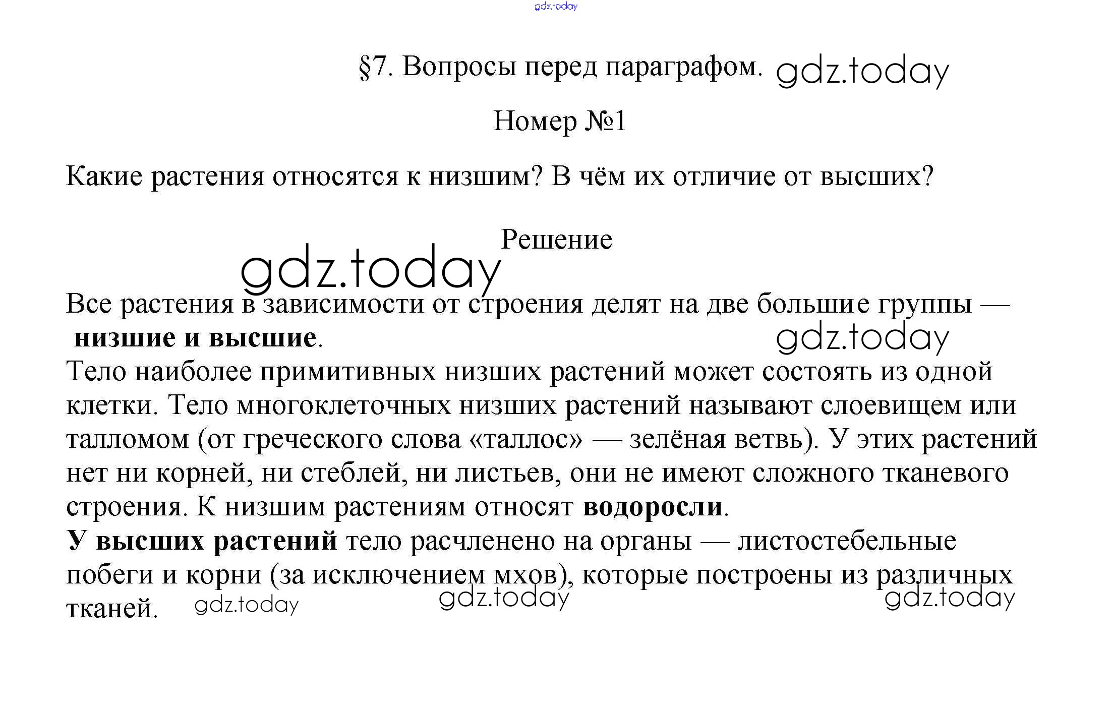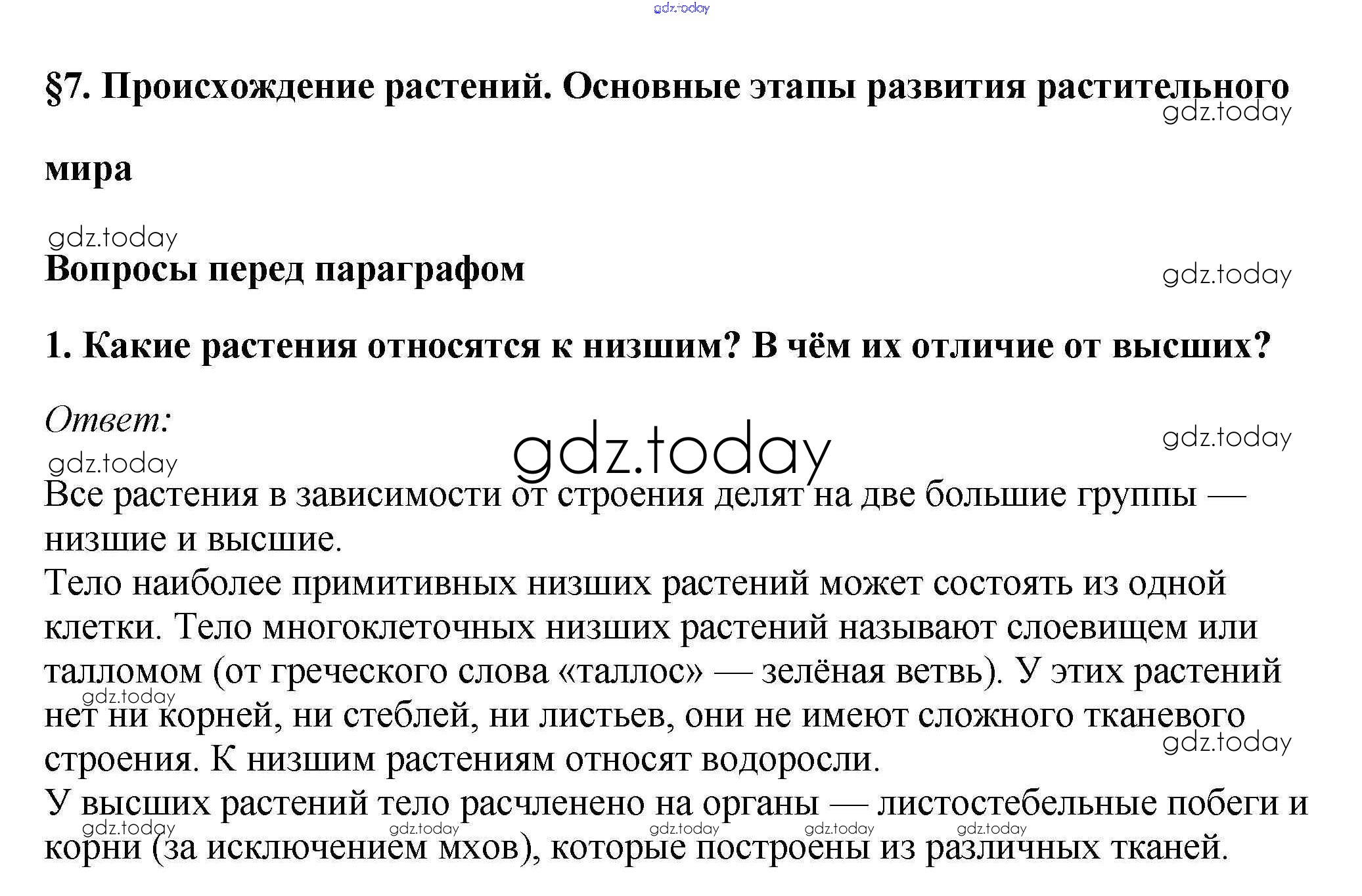 На страницах сайта gdz.today вы найдете учебный и вспомогательный материал, направленный на улучшения знаний школьной программы. ГДЗ - онлайн мир знаний Вопросы перед параграфом Решение к §7. Происхождение растений. Основные этапы развития растительного мира 1 Учебнику по Биологии для 7 класса Пасечник Линейный курс Дрофа 2020