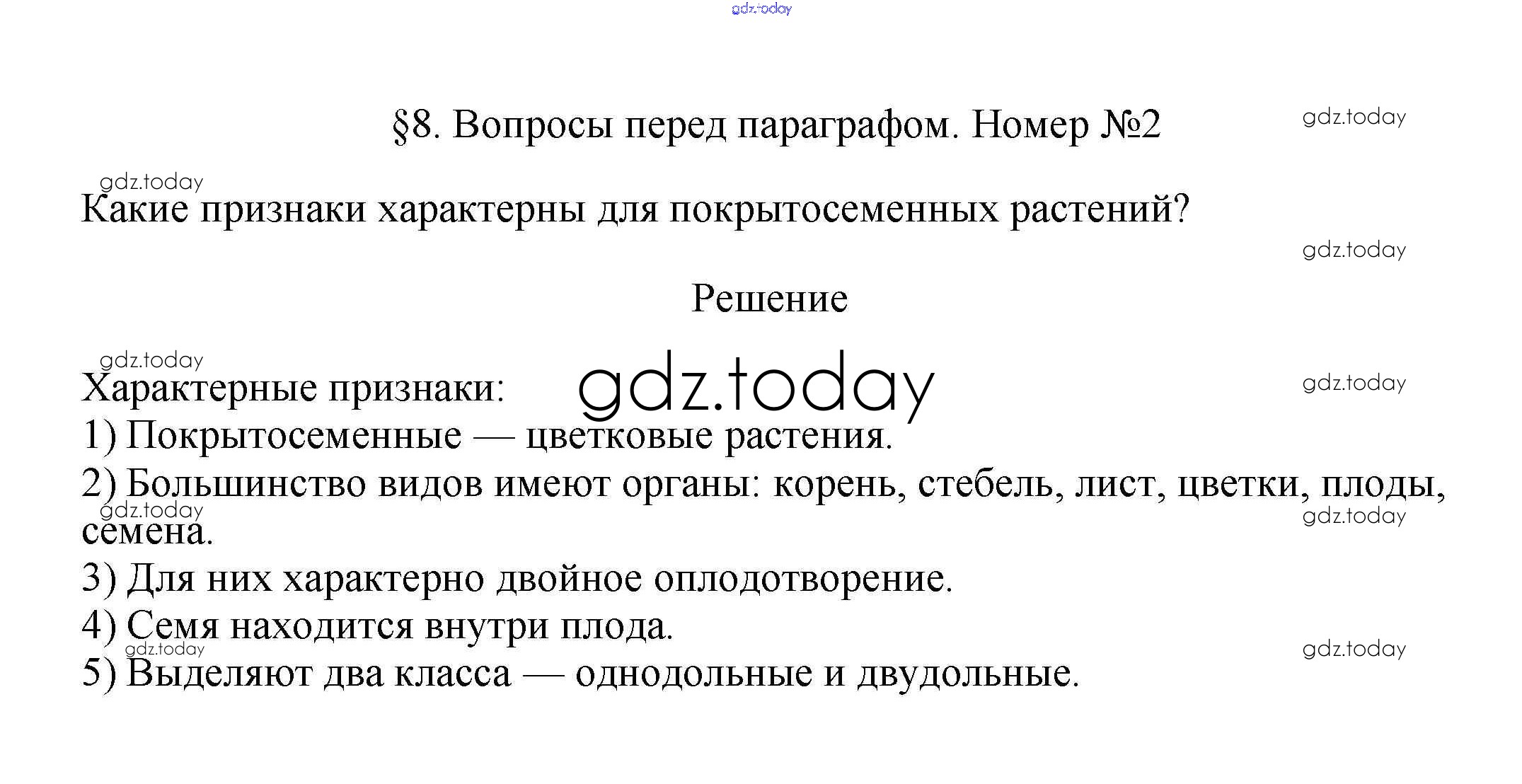 На страницах сайта gdz.today вы найдете учебный и вспомогательный материал, направленный на улучшения знаний школьной программы. ГДЗ - онлайн мир знаний Вопросы перед параграфом Решение к §8. Основы классификации покрытосеменных растений 2 Учебнику по Биологии для 7 класса Пасечник Линейный курс Дрофа 2020