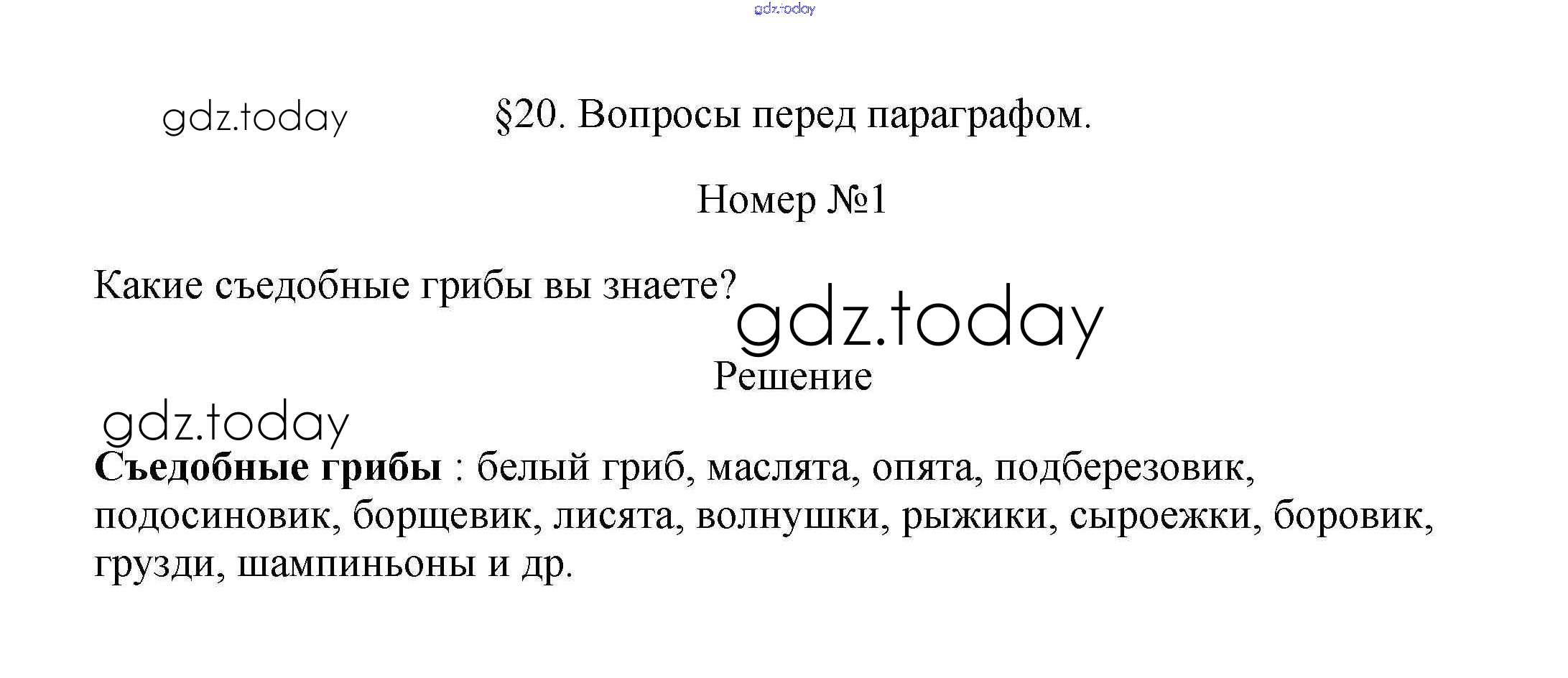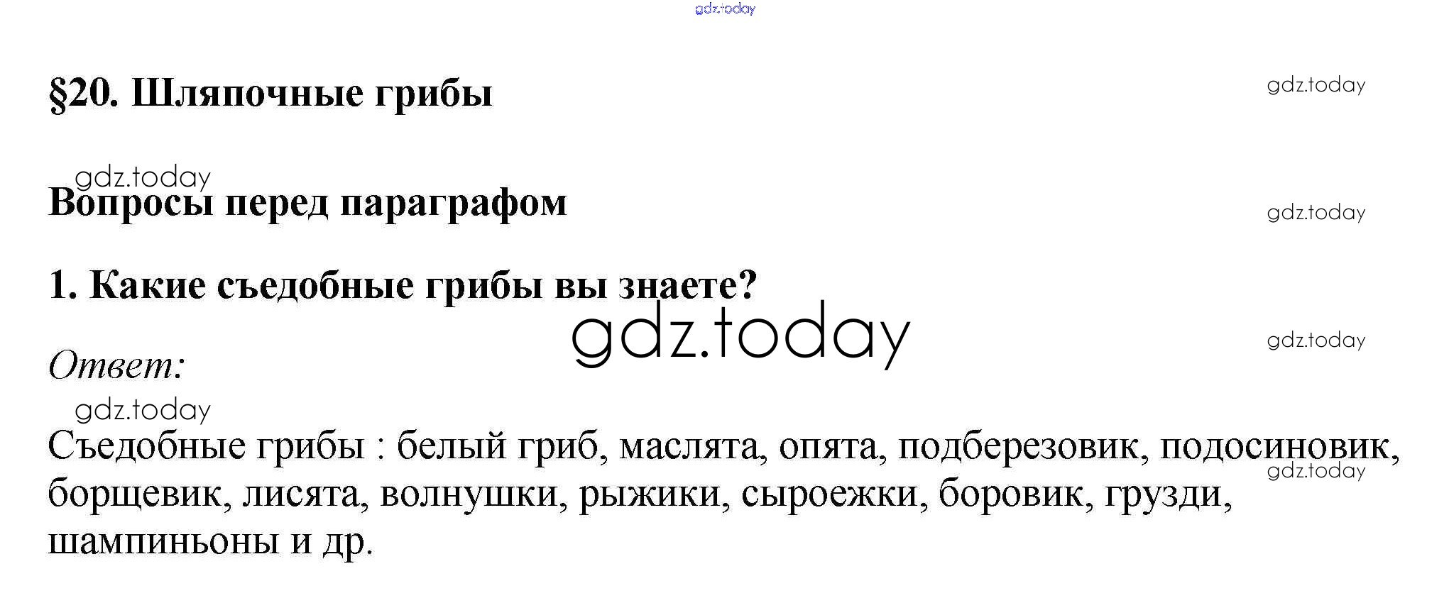 На страницах сайта gdz.today вы найдете учебный и вспомогательный материал, направленный на улучшения знаний школьной программы. ГДЗ - онлайн мир знаний Вопросы перед параграфом Решение к §20. Шляпочные грибы 1 Учебнику по Биологии для 7 класса Пасечник Линейный курс Дрофа 2020