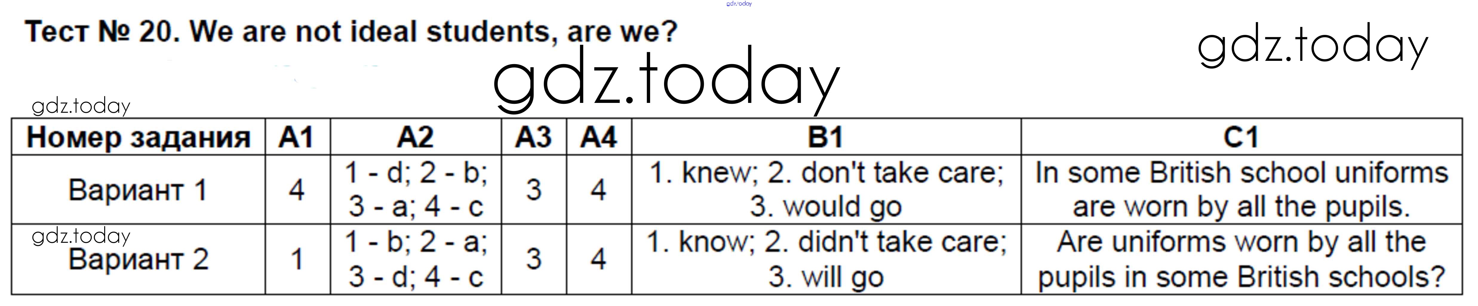 На страницах сайта gdz.today вы найдете учебный и вспомогательный материал, направленный на улучшения знаний школьной программы. ГДЗ - онлайн мир знаний Решение к тестам 20 Контрольно-измерительным материалам (КИМ) по Английскому языку для 7 класса Артюхова ВАКО 2017