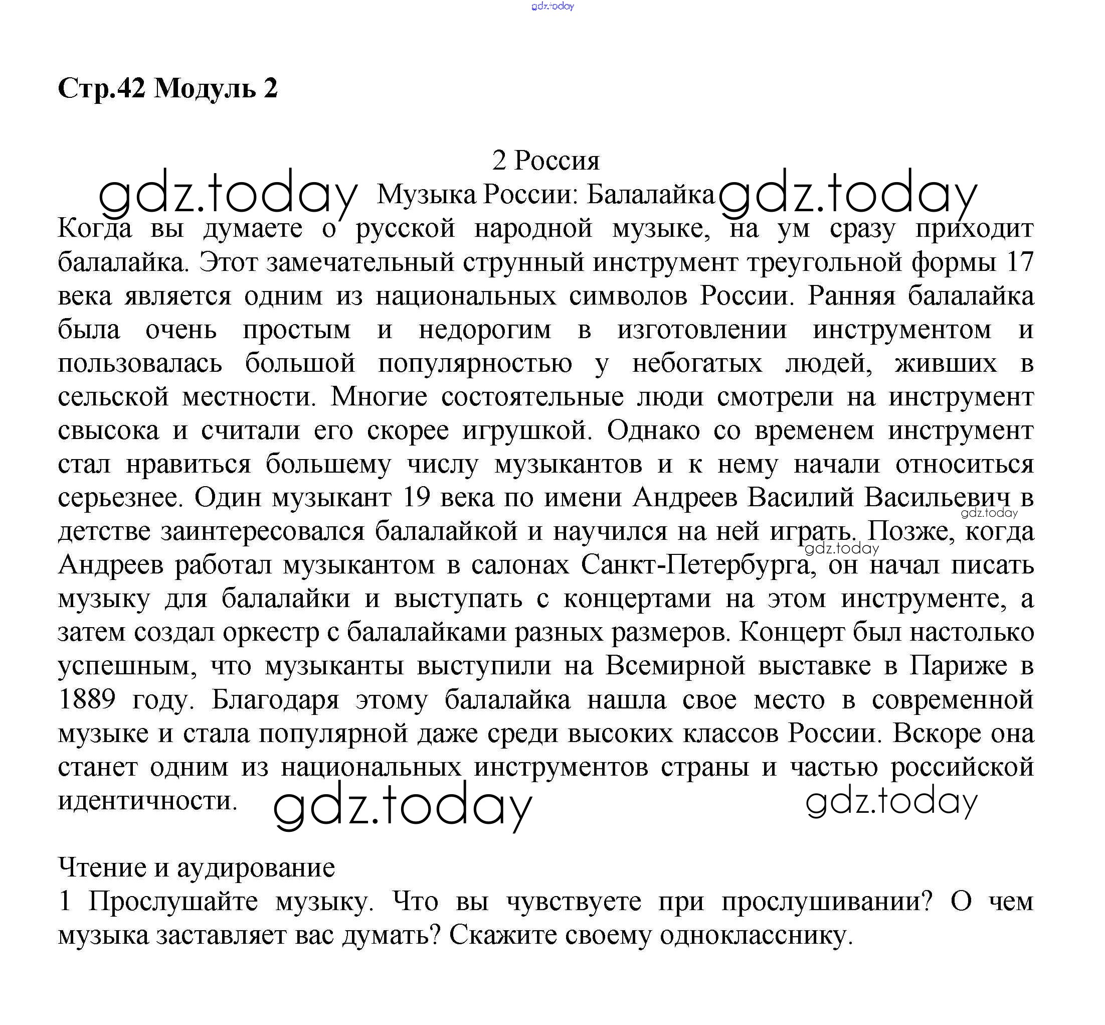 На страницах сайта gdz.today вы найдете учебный и вспомогательный материал, направленный на улучшения знаний школьной программы. ГДЗ - онлайн мир знаний Решение к Module 2 стр.42 Учебнику по Английскому языку для 7 класса Баранова, Дули Углубленный уровень Просвещение Starlight 2017
