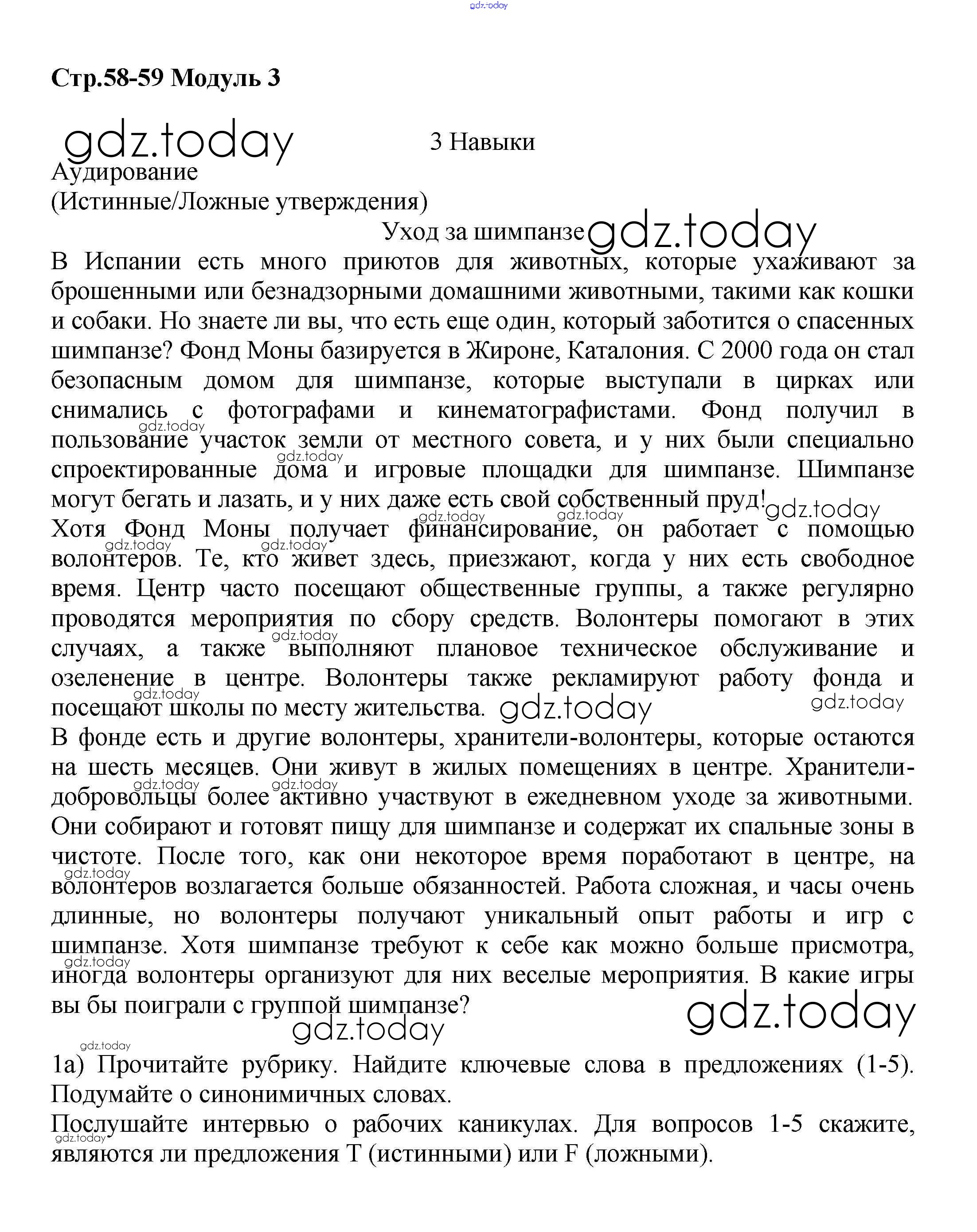 На страницах сайта gdz.today вы найдете учебный и вспомогательный материал, направленный на улучшения знаний школьной программы. ГДЗ - онлайн мир знаний Решение к Module 3 стр.58-59 Учебнику по Английскому языку для 7 класса Баранова, Дули Углубленный уровень Просвещение Starlight 2017