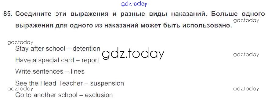 На страницах сайта gdz.today вы найдете учебный и вспомогательный материал, направленный на улучшения знаний школьной программы. ГДЗ - онлайн мир знаний Exercises Unit 3 85 Учебнику по Английскому языку для 7 класса Биболетова, Трубанева Титул, Дрофа УМК 2015, 2017