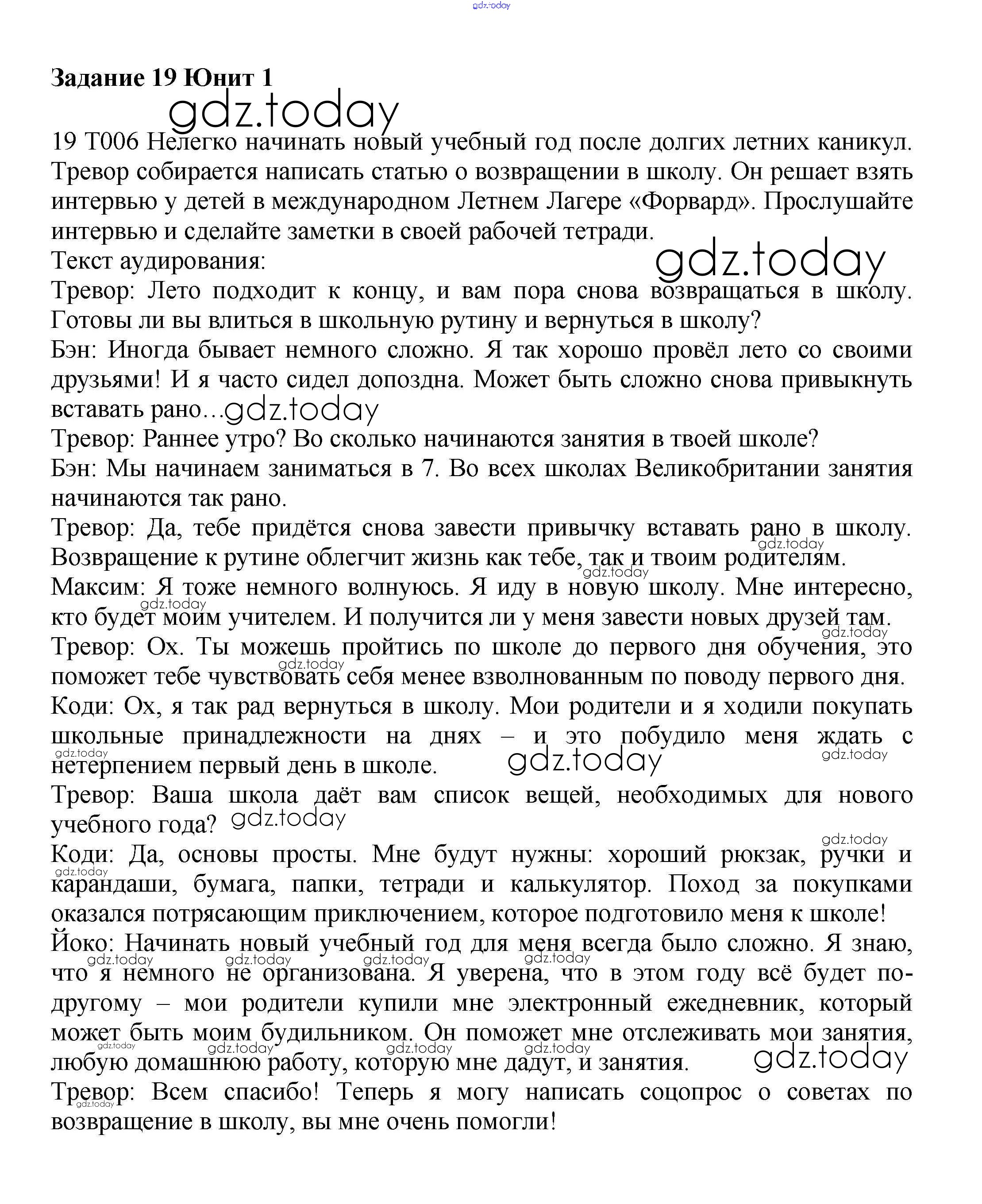 На страницах сайта gdz.today вы найдете учебный и вспомогательный материал, направленный на улучшения знаний школьной программы. ГДЗ - онлайн мир знаний Решение к Unit 1. Comparing schools in different countries Часть 1 19 Учебнику по Английскому языку для 7 класса Вербицкая, Гаярделли Вентана-граф Forward 2017