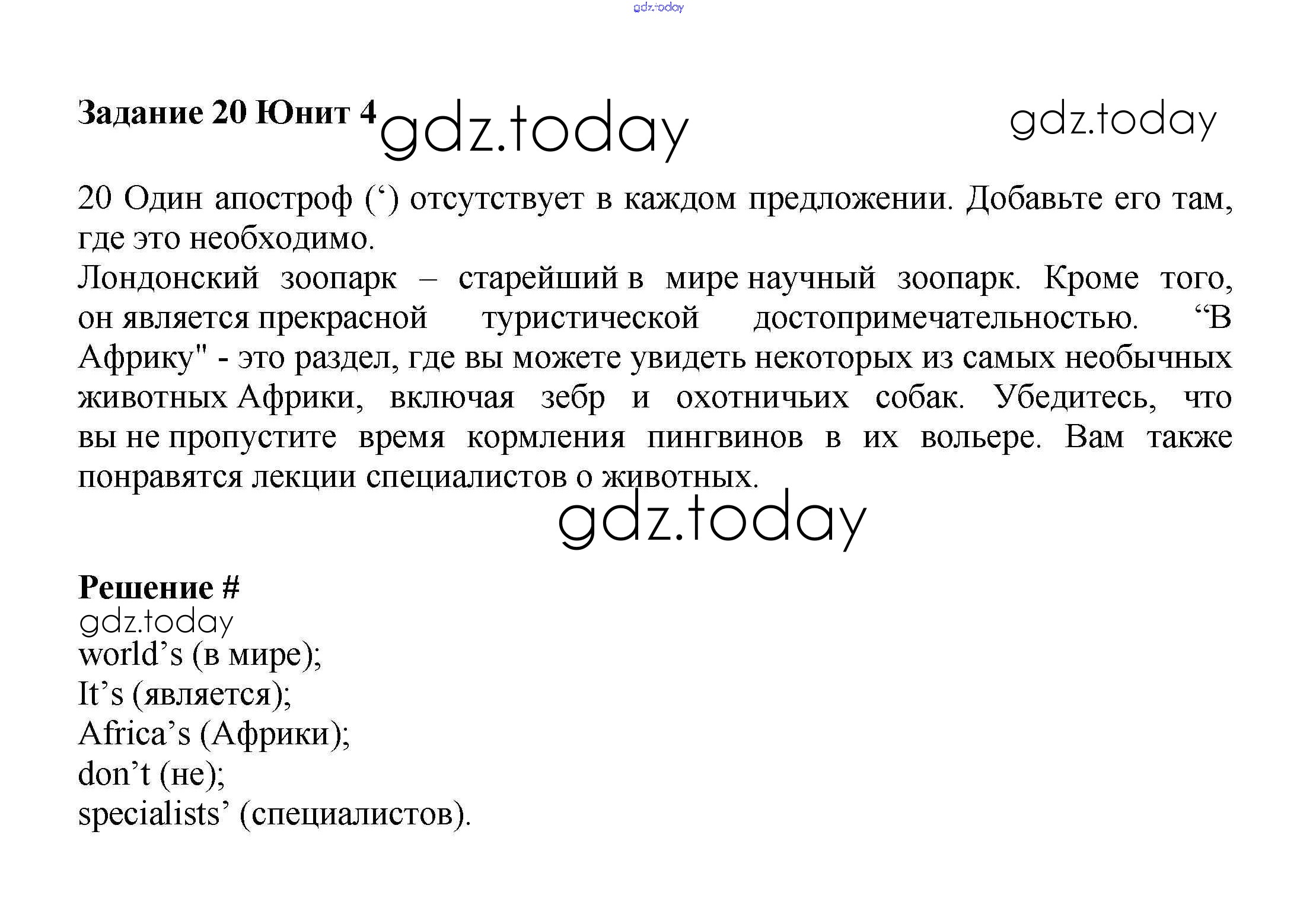 На страницах сайта gdz.today вы найдете учебный и вспомогательный материал, направленный на улучшения знаний школьной программы. ГДЗ - онлайн мир знаний Решение к Unit 4. Animal quiz Часть 1 20 Учебнику по Английскому языку для 7 класса Вербицкая, Гаярделли Вентана-граф Forward 2017
