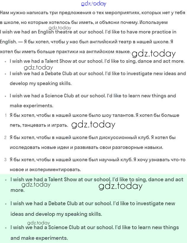 На страницах сайта gdz.today вы найдете учебный и вспомогательный материал, направленный на улучшения знаний школьной программы. ГДЗ - онлайн мир знаний Решение к Unit 5. School activities Часть 1 10 Учебнику по Английскому языку для 7 класса Вербицкая, Гаярделли Вентана-граф Forward 2017