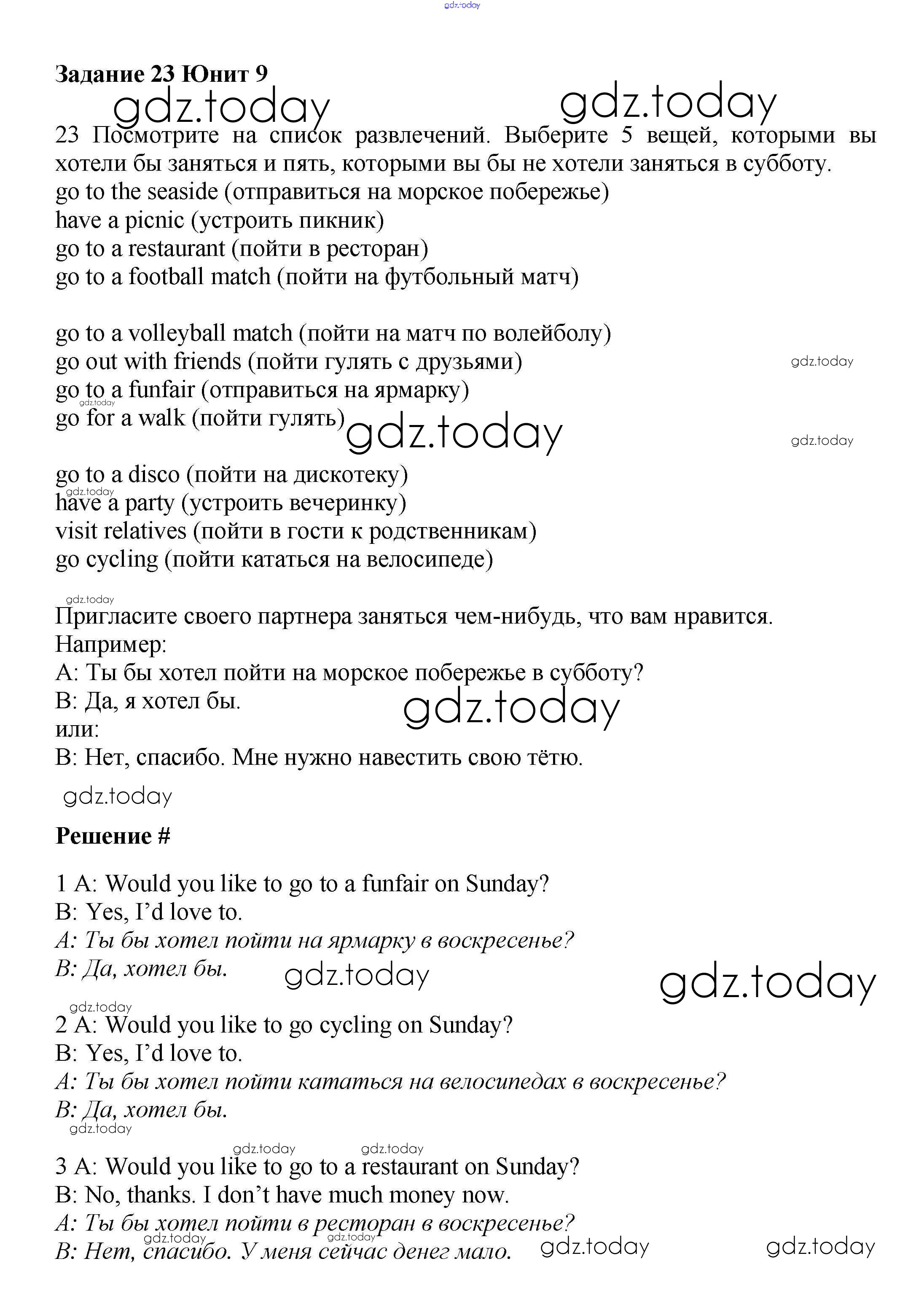 На страницах сайта gdz.today вы найдете учебный и вспомогательный материал, направленный на улучшения знаний школьной программы. ГДЗ - онлайн мир знаний Решение к Unit 9. Free time Часть 2 23 Учебнику по Английскому языку для 7 класса Вербицкая, Гаярделли Вентана-граф Forward 2017