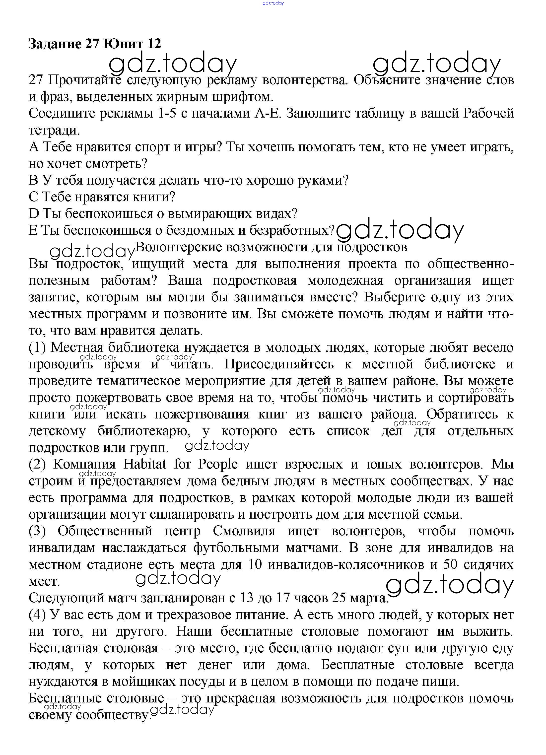 На страницах сайта gdz.today вы найдете учебный и вспомогательный материал, направленный на улучшения знаний школьной программы. ГДЗ - онлайн мир знаний Решение к Unit 12. Social issues Часть 2 27 Учебнику по Английскому языку для 7 класса Вербицкая, Гаярделли Вентана-граф Forward 2017