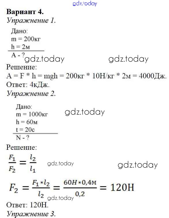 Ответы к КР №-4. Механическая работа и мощность. Простые механизмы Решение к контрольным работам Вариант №4 Дидактическим материалам по Физике для 7 класса Марон Дрофа Вертикаль 2019