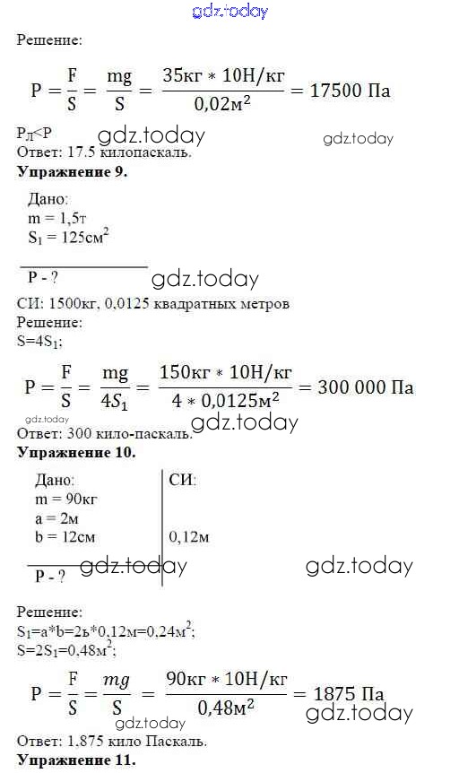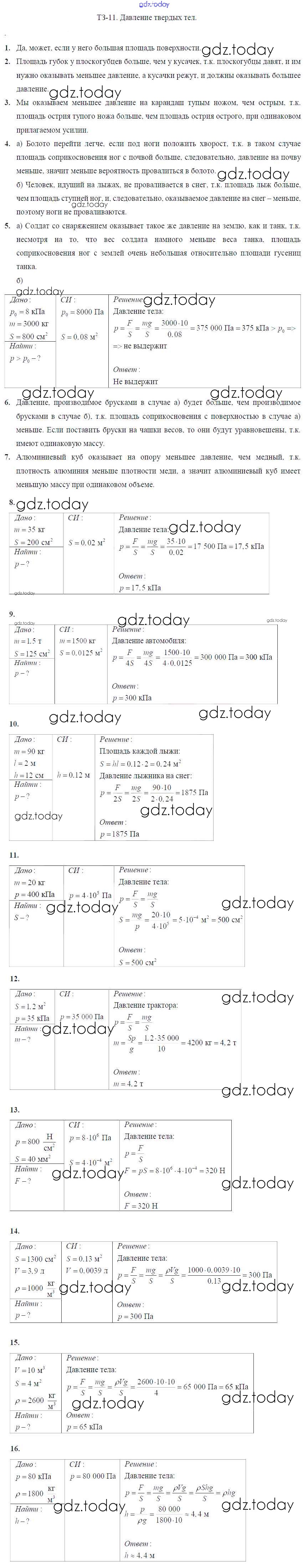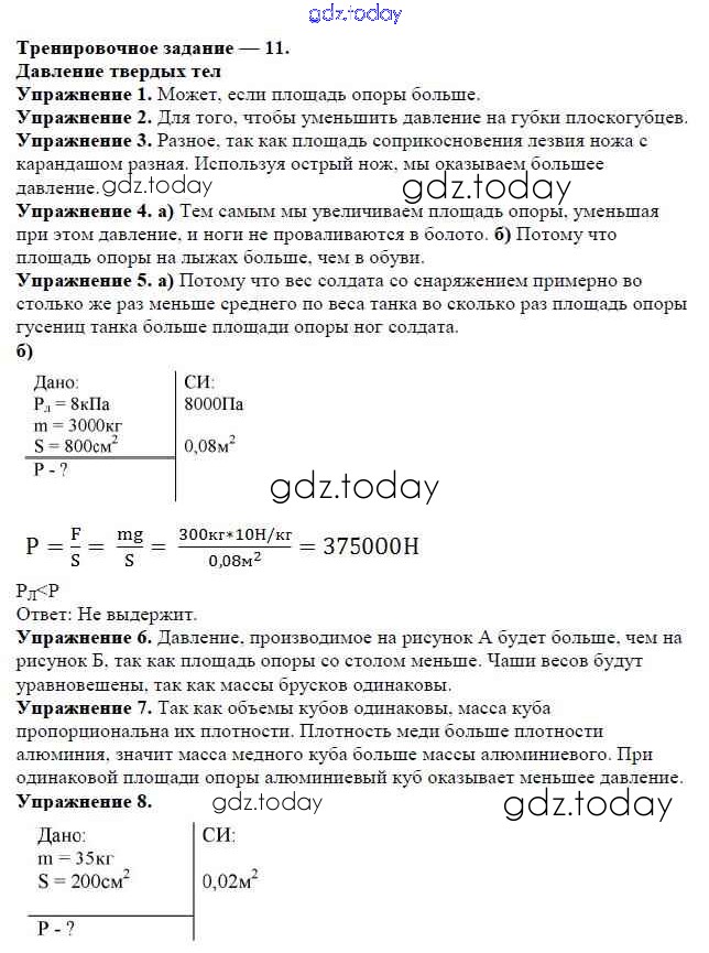 На страницах сайта gdz.today вы найдете учебный и вспомогательный материал, направленный на улучшения знаний школьной программы. ГДЗ - онлайн мир знаний Решение к тренировочным заданияи Задание №11. Давление твердых тел Дидактическим материалам по Физике для 7 класса Марон Дрофа Вертикаль 2019