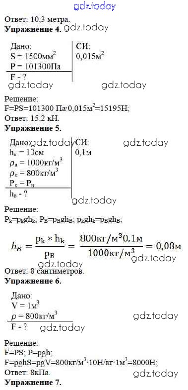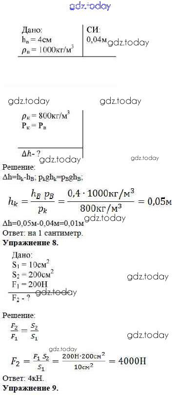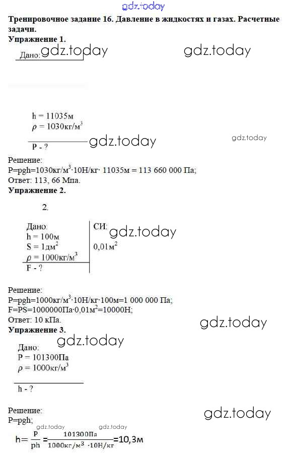 Ответы к Решение к тренировочным заданияи Задание №16. Давление в жидкостях и газах. Расчетные задачи Дидактическим материалам по Физике для 7 класса Марон Дрофа Вертикаль 2019