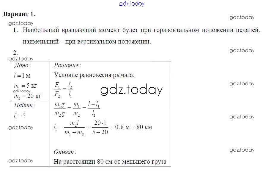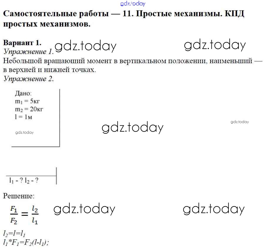 На страницах сайта gdz.today вы найдете учебный и вспомогательный материал, направленный на улучшения знаний школьной программы. ГДЗ - онлайн мир знаний СР №-11. Простые механизмы. КПД простых механизмов Решение к самостоятельным работам Вариант №1 Дидактическим материалам по Физике для 7 класса Марон Дрофа Вертикаль 2019