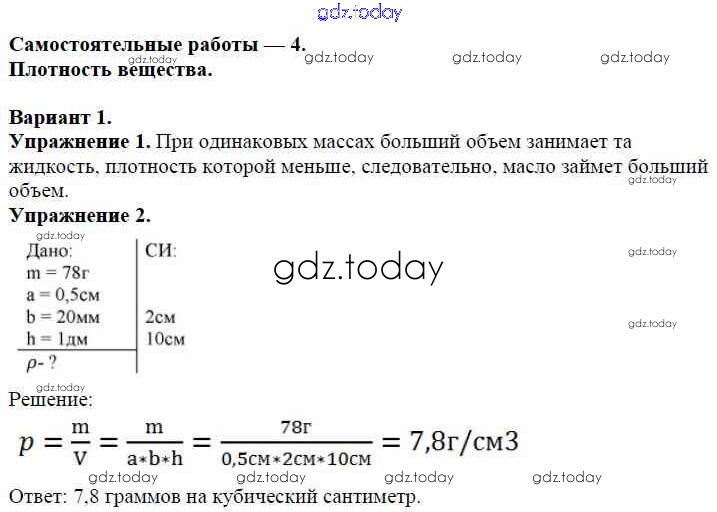 На страницах сайта gdz.today вы найдете учебный и вспомогательный материал, направленный на улучшения знаний школьной программы. ГДЗ - онлайн мир знаний СР №-4. Плотность вещества Решение к самостоятельным работам Вариант №1 Дидактическим материалам по Физике для 7 класса Марон Дрофа Вертикаль 2019