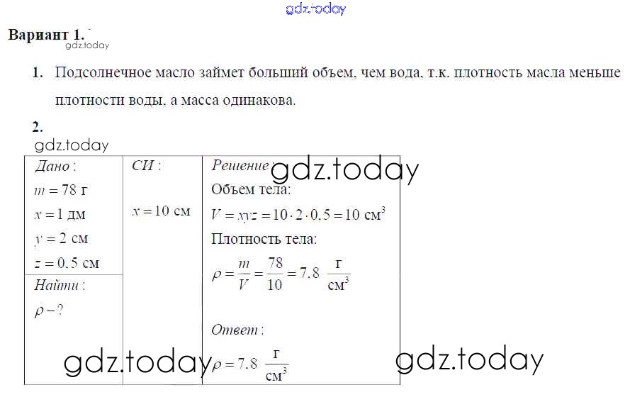 Ответы к СР №-4. Плотность вещества Решение к самостоятельным работам Вариант №1 Дидактическим материалам по Физике для 7 класса Марон Дрофа Вертикаль 2019