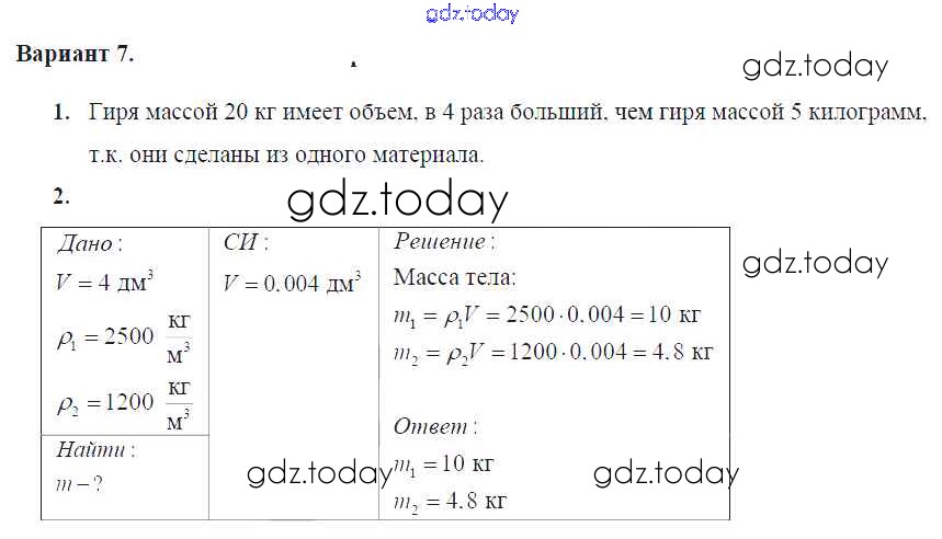 На страницах сайта gdz.today вы найдете учебный и вспомогательный материал, направленный на улучшения знаний школьной программы. ГДЗ - онлайн мир знаний СР №-4. Плотность вещества Решение к самостоятельным работам Вариант №7 Дидактическим материалам по Физике для 7 класса Марон Дрофа Вертикаль 2019