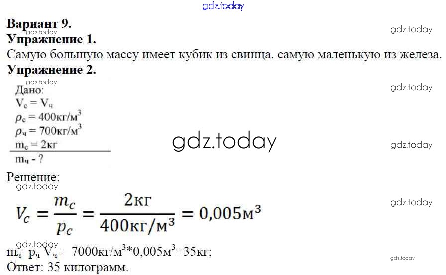 Ответы к СР №-4. Плотность вещества Решение к самостоятельным работам Вариант №9 Дидактическим материалам по Физике для 7 класса Марон Дрофа Вертикаль 2019