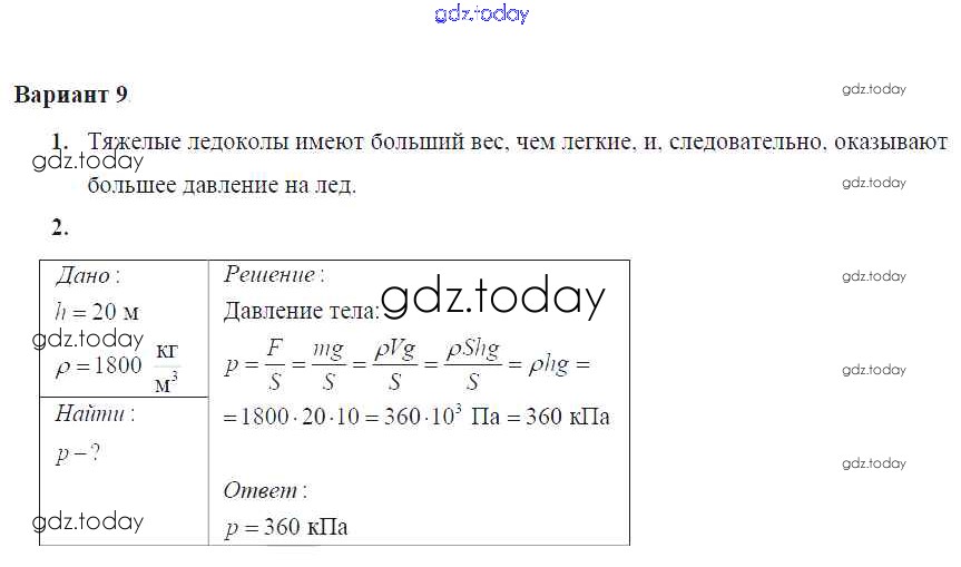 На страницах сайта gdz.today вы найдете учебный и вспомогательный материал, направленный на улучшения знаний школьной программы. ГДЗ - онлайн мир знаний СР №-6. Давление твердых тел Решение к самостоятельным работам Вариант №9 Дидактическим материалам по Физике для 7 класса Марон Дрофа Вертикаль 2019