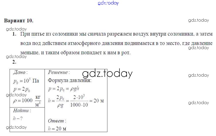 На страницах сайта gdz.today вы найдете учебный и вспомогательный материал, направленный на улучшения знаний школьной программы. ГДЗ - онлайн мир знаний СР №-7. Давление в жидкостях и газах Решение к самостоятельным работам Вариант №10 Дидактическим материалам по Физике для 7 класса Марон Дрофа Вертикаль 2019