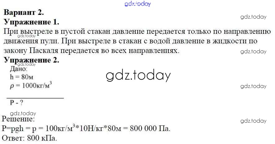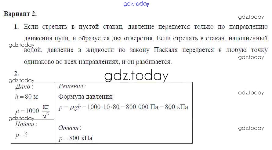 На страницах сайта gdz.today вы найдете учебный и вспомогательный материал, направленный на улучшения знаний школьной программы. ГДЗ - онлайн мир знаний СР №-7. Давление в жидкостях и газах Решение к самостоятельным работам Вариант №2 Дидактическим материалам по Физике для 7 класса Марон Дрофа Вертикаль 2019
