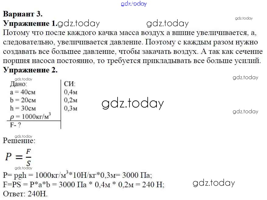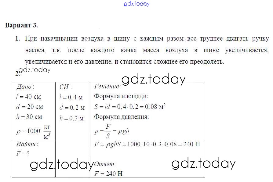 На страницах сайта gdz.today вы найдете учебный и вспомогательный материал, направленный на улучшения знаний школьной программы. ГДЗ - онлайн мир знаний СР №-7. Давление в жидкостях и газах Решение к самостоятельным работам Вариант №3 Дидактическим материалам по Физике для 7 класса Марон Дрофа Вертикаль 2019