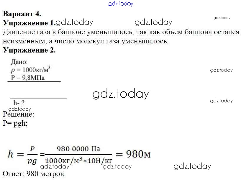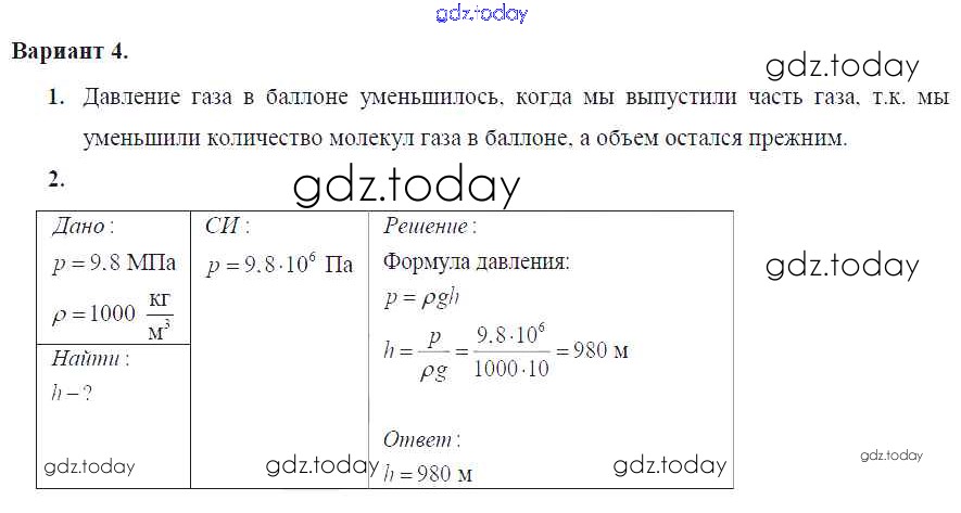 На страницах сайта gdz.today вы найдете учебный и вспомогательный материал, направленный на улучшения знаний школьной программы. ГДЗ - онлайн мир знаний СР №-7. Давление в жидкостях и газах Решение к самостоятельным работам Вариант №4 Дидактическим материалам по Физике для 7 класса Марон Дрофа Вертикаль 2019