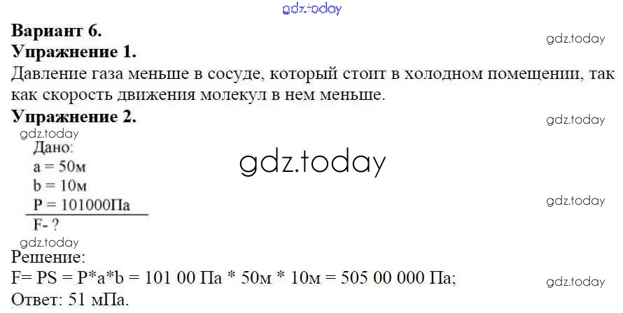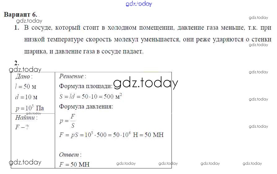 На страницах сайта gdz.today вы найдете учебный и вспомогательный материал, направленный на улучшения знаний школьной программы. ГДЗ - онлайн мир знаний СР №-7. Давление в жидкостях и газах Решение к самостоятельным работам Вариант №6 Дидактическим материалам по Физике для 7 класса Марон Дрофа Вертикаль 2019