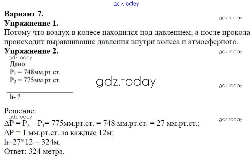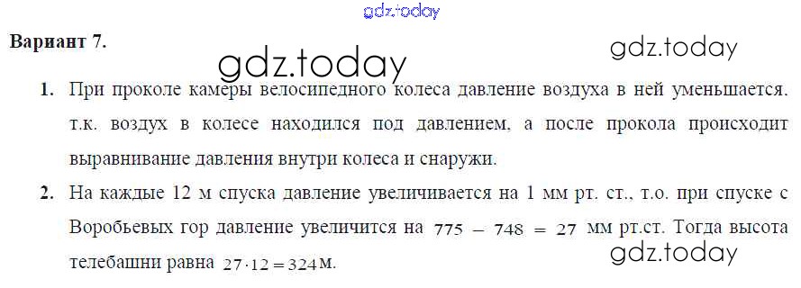 На страницах сайта gdz.today вы найдете учебный и вспомогательный материал, направленный на улучшения знаний школьной программы. ГДЗ - онлайн мир знаний СР №-7. Давление в жидкостях и газах Решение к самостоятельным работам Вариант №7 Дидактическим материалам по Физике для 7 класса Марон Дрофа Вертикаль 2019