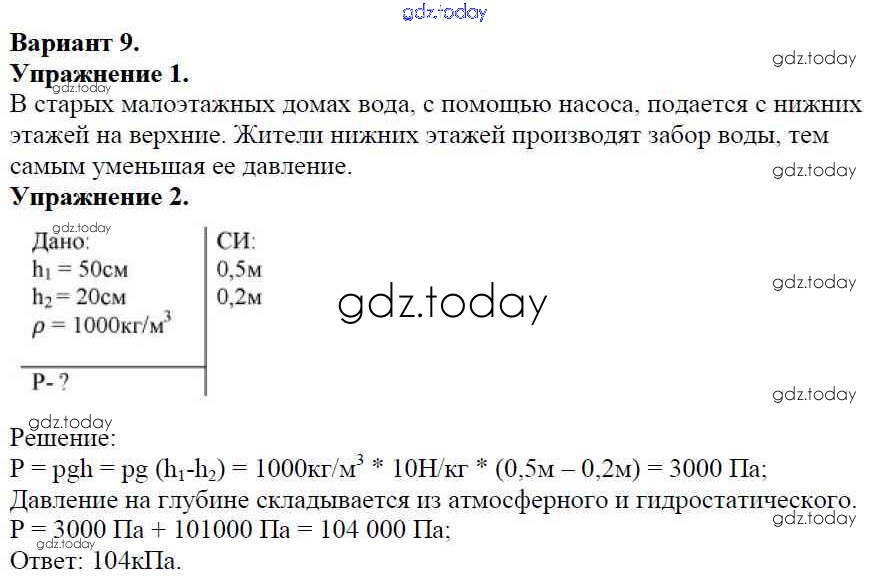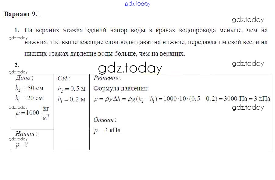 На страницах сайта gdz.today вы найдете учебный и вспомогательный материал, направленный на улучшения знаний школьной программы. ГДЗ - онлайн мир знаний СР №-7. Давление в жидкостях и газах Решение к самостоятельным работам Вариант №9 Дидактическим материалам по Физике для 7 класса Марон Дрофа Вертикаль 2019