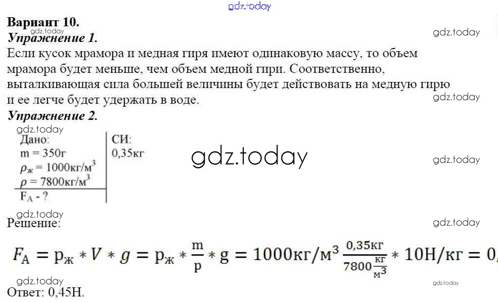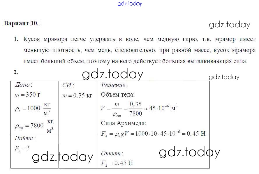 На страницах сайта gdz.today вы найдете учебный и вспомогательный материал, направленный на улучшения знаний школьной программы. ГДЗ - онлайн мир знаний СР №-8. Архимедова сила. Плавание тел Решение к самостоятельным работам Вариант №10 Дидактическим материалам по Физике для 7 класса Марон Дрофа Вертикаль 2019