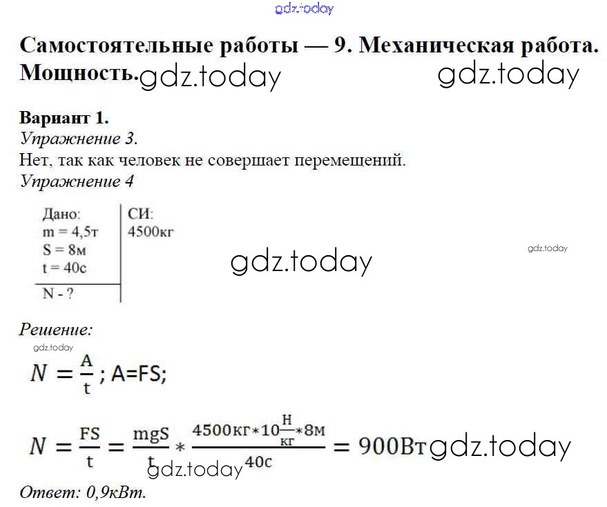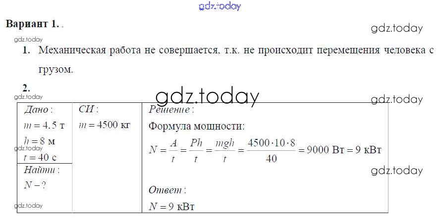 На страницах сайта gdz.today вы найдете учебный и вспомогательный материал, направленный на улучшения знаний школьной программы. ГДЗ - онлайн мир знаний СР №-9. Механическая работа. Мощность Решение к самостоятельным работам Вариант №1 Дидактическим материалам по Физике для 7 класса Марон Дрофа Вертикаль 2019
