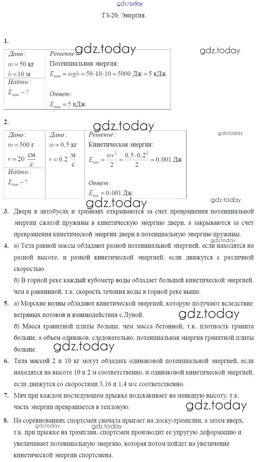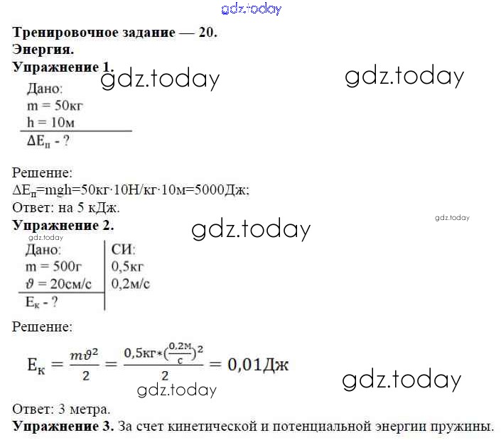 На страницах сайта gdz.today вы найдете учебный и вспомогательный материал, направленный на улучшения знаний школьной программы. ГДЗ - онлайн мир знаний Решение к тренировочным заданияи Задание №20. Энергия Дидактическим материалам по Физике для 7 класса Марон Дрофа Вертикаль 2019